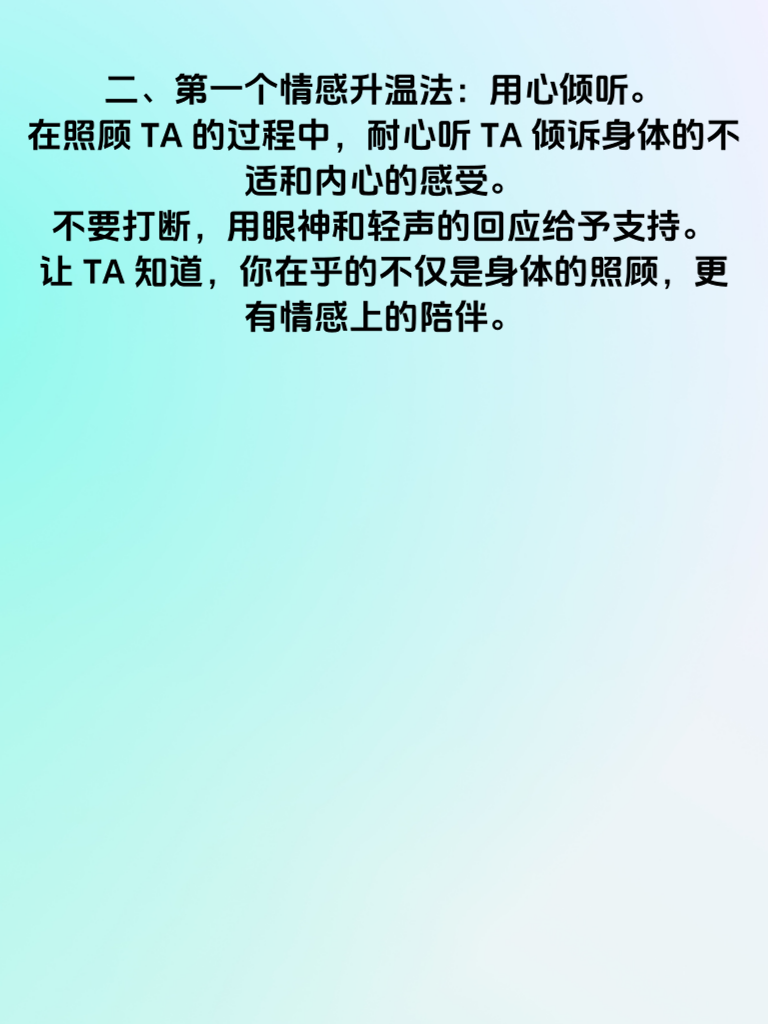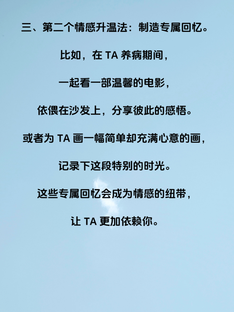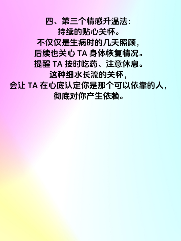 一、当TA生病时,主动照顾是拉近彼此距离的绝佳契机。在这个特殊时刻,你的贴心关怀会像温暖的阳光,照进TA的心里。比如,为TA熬一碗热气腾腾的粥,既能补充营养,又饱含着你的爱意。 二、第一个情感升温法:用心倾听。在照顾TA的过程中,耐心听TA倾诉身体的不适和内心的感受。不要打断,用眼神和轻声的回应给予支持。让TA知道,你在乎的不仅是身体的照顾,更有情感上的陪伴。 三、第二个情感升温法:制造专属回忆。比如,在TA养病期间,一起看一部温馨的电影,依偎在沙发上,分享彼此的感悟。或者为TA画一幅简单却充满心意的画,记录下这段特别的时光。这些专属回忆会成为情感的纽带,让TA更加依赖你。 四、第三个情感升温法:持续的贴心关怀。不仅仅是生病时的几天照顾,后续也关心TA身体恢复情况。提醒TA按时吃药、注意休息。这种细水长流的关怀,会让TA在心底认定你是那个可以依靠的人,彻底对你产生依赖。