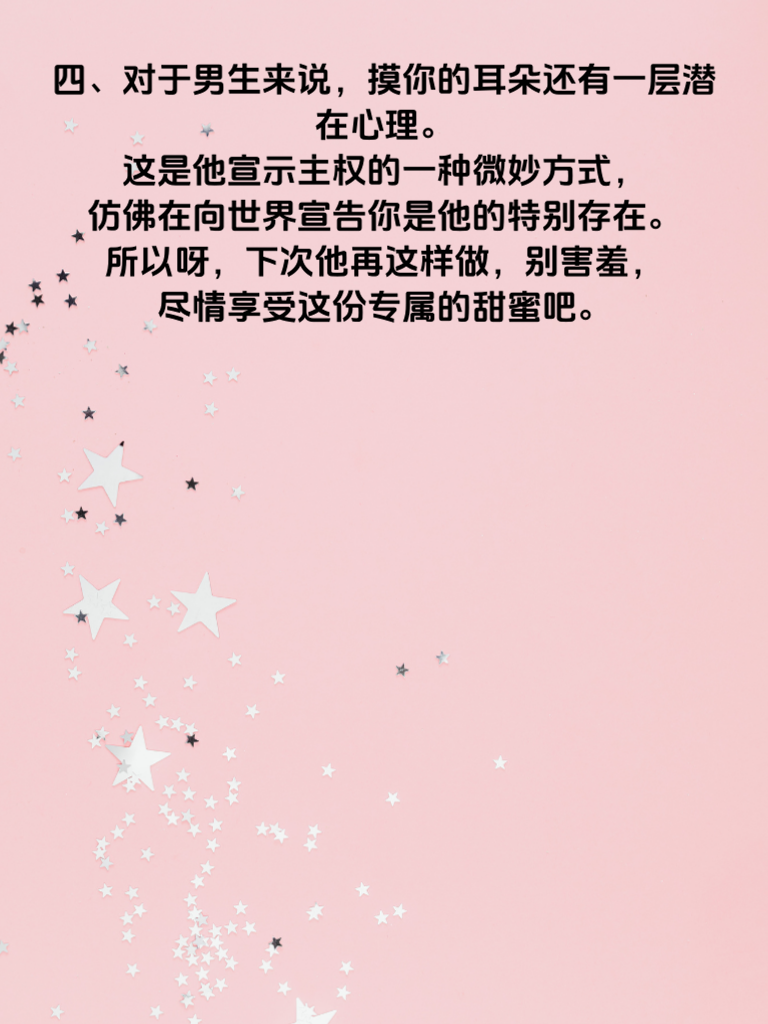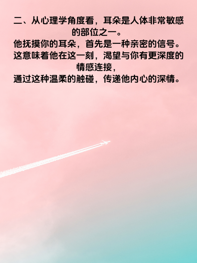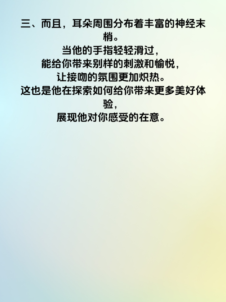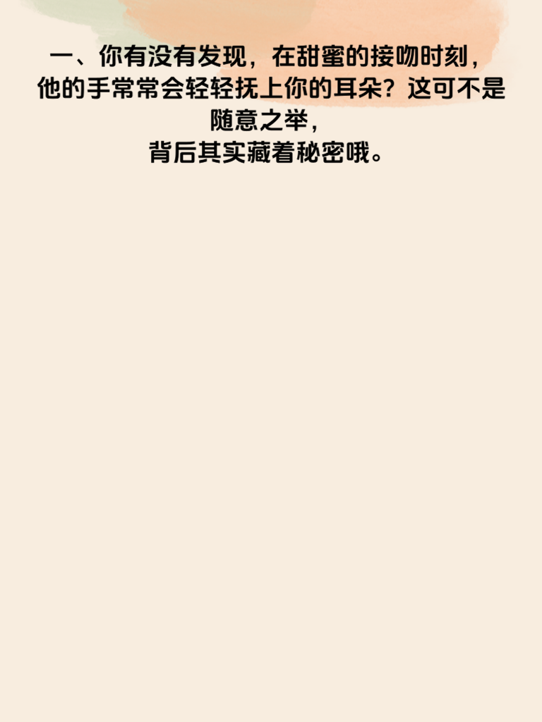 一、你有没有发现,在甜蜜的接吻时刻,他的手常常会轻轻抚上你的耳朵?这可不是随意之举,背后其实藏着秘密哦。 二、从心理学角度看,耳朵是人体非常敏感的部位之一。他抚摸你的耳朵,首先是一种亲密的信号。这意味着他在这一刻,渴望与你有更深度的情感连接,通过这种温柔的触碰,传递他内心的深情。 三、而且,耳朵周围分布着丰富的神经末梢。当他的手指轻轻滑过,能给你带来别样的刺激和愉悦,让接吻的氛围更加炽热。这也是他在探索如何给你带来更多美好体验,展现他对你感受的在意。 四、对于男生来说,摸你的耳朵还有一层潜在心理。这是他宣示主权的一种微妙方式,仿佛在向世界宣告你是他的特别存在。所以呀,下次他再这样做,别害羞,尽情享受这份专属的甜蜜吧。