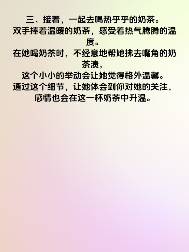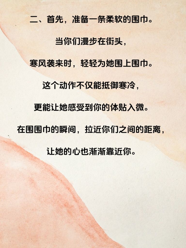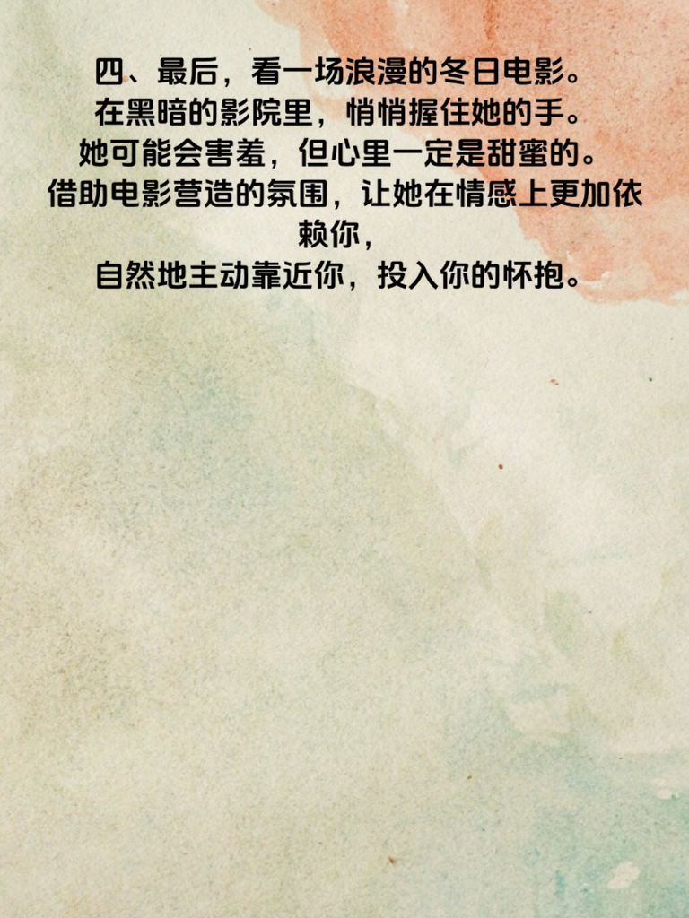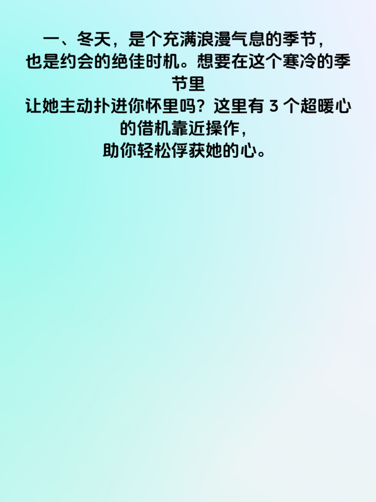 一、冬天,是个充满浪漫气息的季节,也是约会的绝佳时机。想要在这个寒冷的季节里让她主动扑进你怀里吗?这里有3个超暖心的借机靠近操作,助你轻松俘获她的心。 二、首先,准备一条柔软的围巾。当你们漫步在街头,寒风袭来时,轻轻为她围上围巾。这个动作不仅能抵御寒冷,更能让她感受到你的体贴入微。在围围巾的瞬间,拉近你们之间的距离,让她的心也渐渐靠近你。 三、接着,一起去喝热乎乎的奶茶。双手捧着温暖的奶茶,感受着热气腾腾的温度。在她喝奶茶时,不经意地帮她拂去嘴角的奶茶渍,这个小小的举动会让她觉得格外温馨。通过这个细节,让她体会到你对她的关注,感情也会在这一杯奶茶中升温。 四、最后,看一场浪漫的冬日电影。在黑暗的影院里,悄悄握住她的手。她可能会害羞,但心里一定是甜蜜的。借助电影营造的氛围,让她在情感上更加依赖你,自然地主动靠近你,投入你的怀抱。