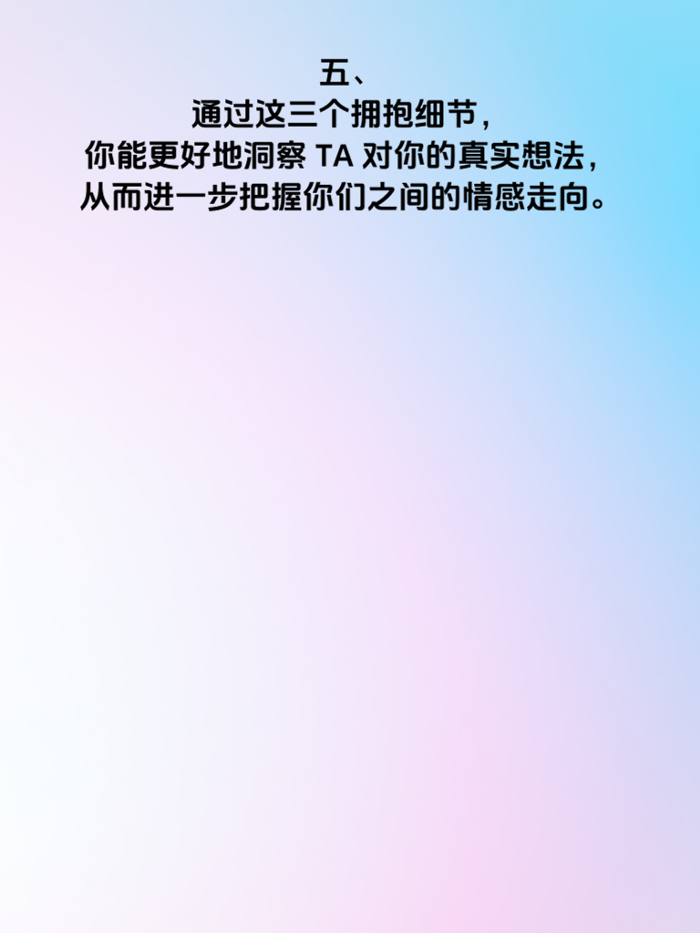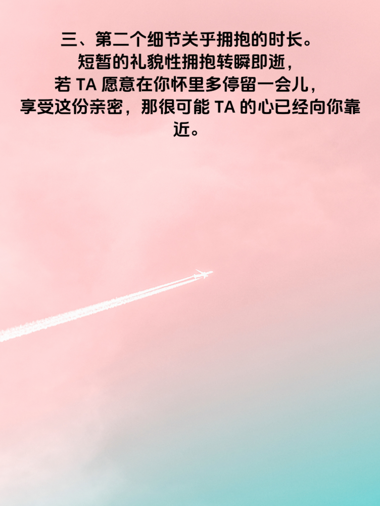 一、在男女相处中,拥抱是一种很微妙的肢体语言。从礼貌性拥抱到恋人式拥抱,其中的转变往往藏着许多秘密。 二、第一个细节是拥抱的力度。礼貌性拥抱通常比较轻柔,只是简单地贴一下身体。而当对方开始用适度的力量抱紧你,让你感受到彼此的体温和心跳,这可能意味着TA对你有了更深的情感,不再满足于表面的礼貌。 三、第二个细节关乎拥抱的时长。短暂的礼貌性拥抱转瞬即逝,若TA愿意在你怀里多停留一会儿,享受这份亲密,那很可能TA的心已经向你靠近。 四、最后一个细节是拥抱时的姿势。礼貌性拥抱可能只是双臂轻轻搭在对方后背,而恋人式拥抱会更紧密,比如双手环绕、身体贴合。如果TA开始有这些更亲密的姿势,说明TA对你的感情正在升温。 五、通过这三个拥抱细节,你能更好地洞察TA对你的真实想法,从而进一步把握你们之间的情感走向。