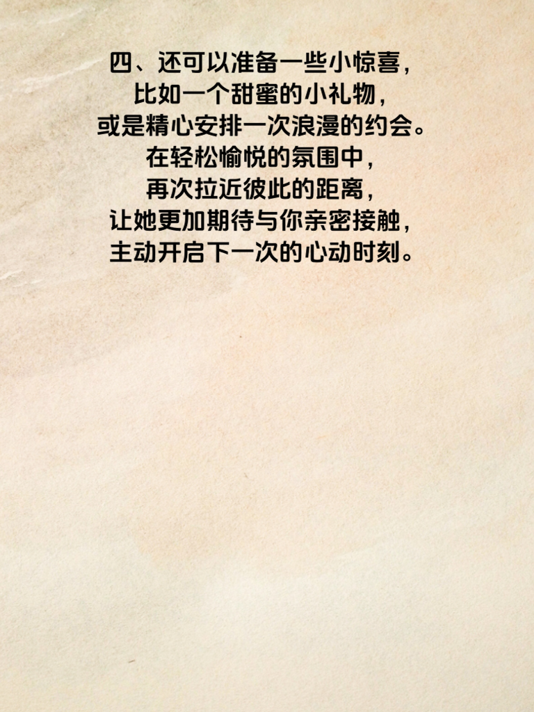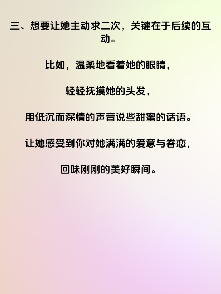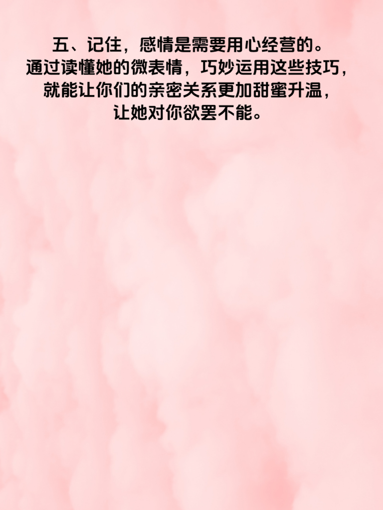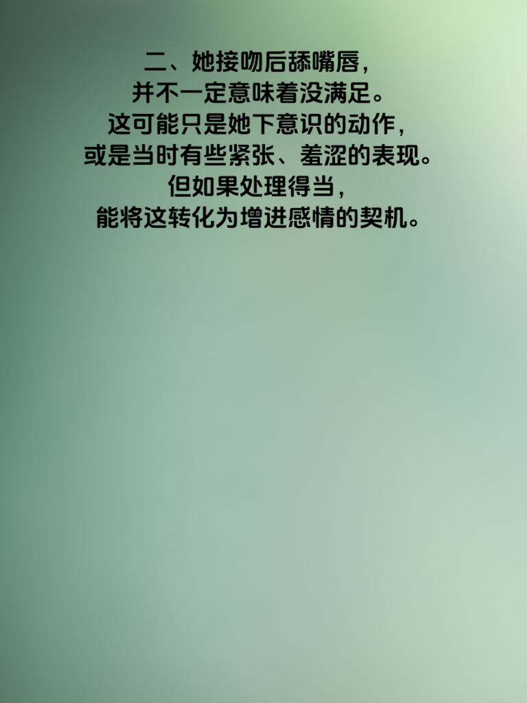 一、你是否曾在接吻后,满心期待她的回应,却因她舔了舔嘴唇而心生疑惑,觉得自己没让她满足?其实,女生接吻后的微表情藏着不少秘密。 二、她接吻后舔嘴唇,并不一定意味着没满足。这可能只是她下意识的动作,或是当时有些紧张、羞涩的表现。但如果处理得当,能将这转化为增进感情的契机。 三、想要让她主动求二次,关键在于后续的互动。比如,温柔地看着她的眼睛,轻轻抚摸她的头发,用低沉而深情的声音说些甜蜜的话语。让她感受到你对她满满的爱意与眷恋,回味刚刚的美好瞬间。 四、还可以准备一些小惊喜,比如一个甜蜜的小礼物,或是精心安排一次浪漫的约会。在轻松愉悦的氛围中,再次拉近彼此的距离,让她更加期待与你亲密接触,主动开启下一次的心动时刻。 五、记住,感情是需要用心经营的。通过读懂她的微表情,巧妙运用这些技巧,就能让你们的亲密关系更加甜蜜升温,让她对你欲罢不能。