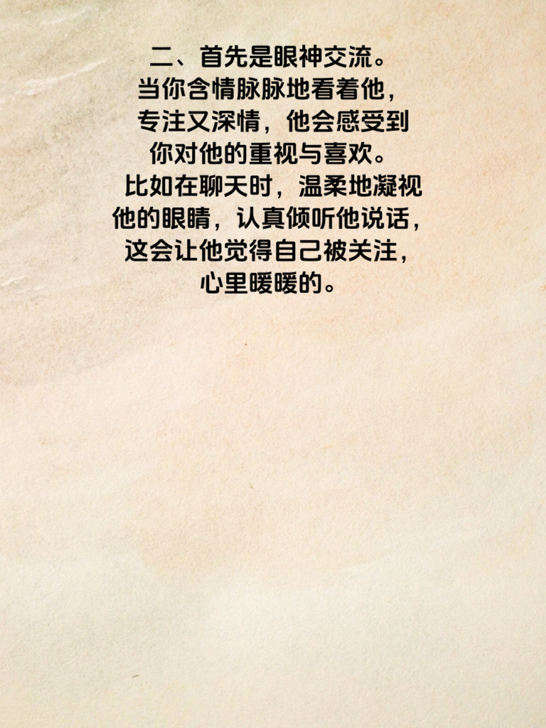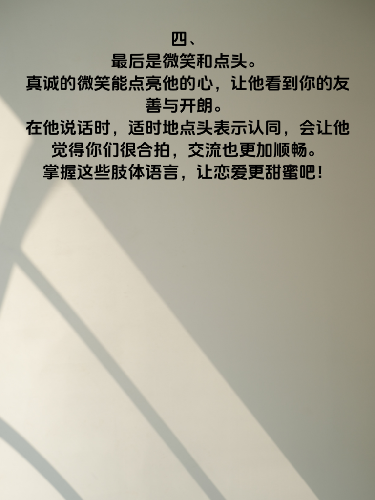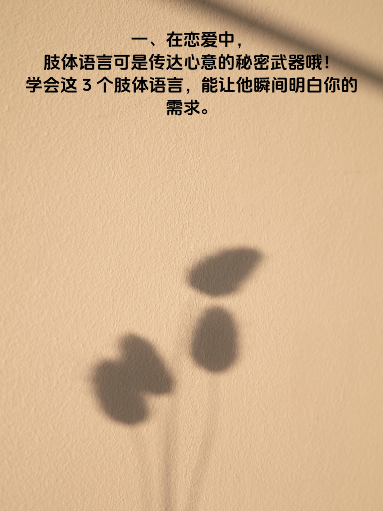 一、在恋爱中,肢体语言可是传达心意的秘密武器哦!学会这3个肢体语言,能让他瞬间明白你的需求。 二、首先是眼神交流。当你含情脉脉地看着他,专注又深情,他会感受到你对他的重视与喜欢。比如在聊天时,温柔地凝视他的眼睛,认真倾听他说话,这会让他觉得自己被关注,心里暖暖的。 三、其次是轻轻触碰。不经意地碰一下他的手臂、肩膀,这种小小的肢体接触会拉近你们的距离。一起散步时,自然地挽着他的胳膊,能传递出你对他的依赖,让他更有保护你的欲望。 四、最后是微笑和点头。真诚的微笑能点亮他的心,让他看到你的友善与开朗。在他说话时,适时地点头表示认同,会让他觉得你们很合拍,交流也更加顺畅。掌握这些肢体语言,让恋爱更甜蜜吧!