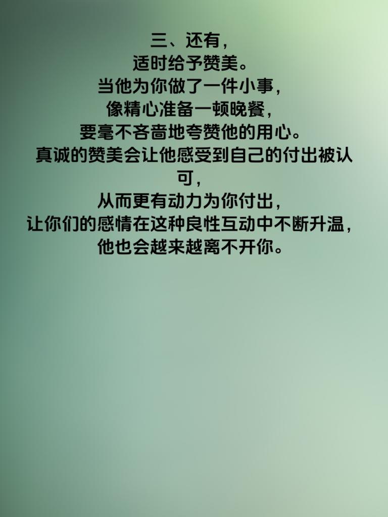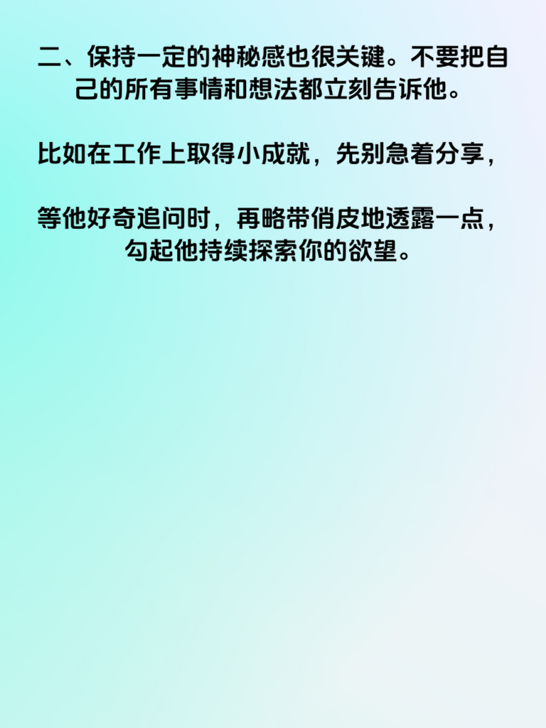 一、在恋爱中,女生的一些小心机能让感情更加甜蜜,让他越来越离不开你。首先,偶尔的小作怡情。不要总是毫无原则地迁就,适当耍点小性子,比如在他答应陪你却临时有事爽约时,表现出小委屈。但要把握好度,让他知道你在意他,又不是无理取闹。 二、保持一定的神秘感也很关键。不要把自己的所有事情和想法都立刻告诉他。比如在工作上取得小成就,先别急着分享,等他好奇追问时,再略带俏皮地透露一点,勾起他持续探索你的欲望。 三、还有,适时给予赞美。当他为你做了一件小事,像精心准备一顿晚餐,要毫不吝啬地夸赞他的用心。真诚的赞美会让他感受到自己的付出被认可,从而更有动力为你付出,让你们的感情在这种良性互动中不断升温,他也会越来越离不开你。