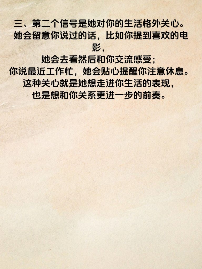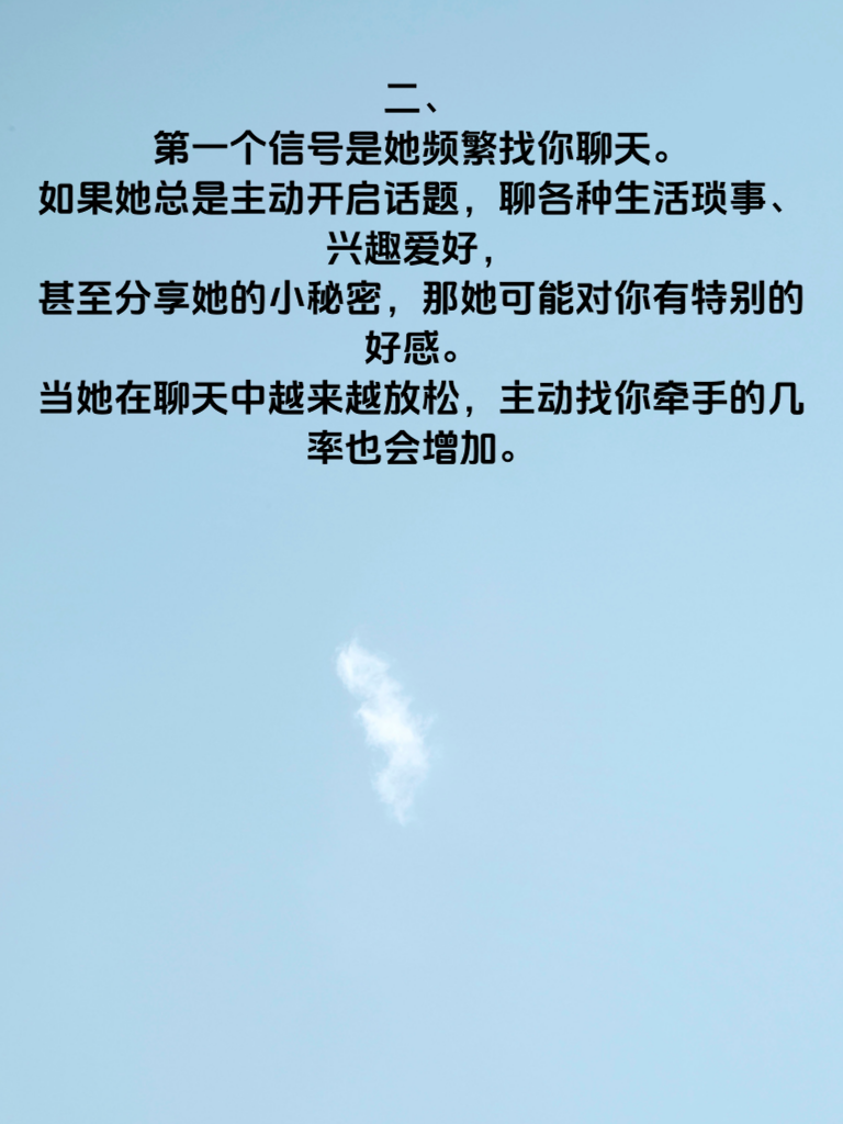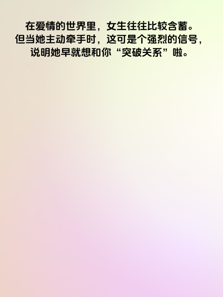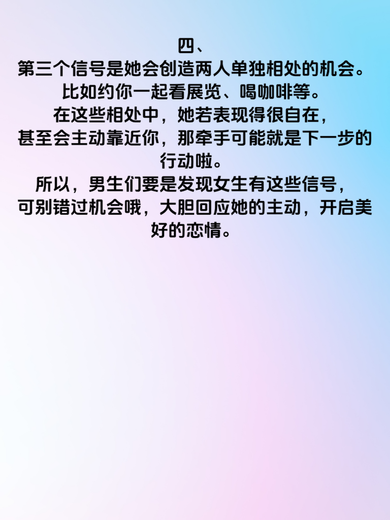 一、在爱情的世界里,女生往往比较含蓄。但当她主动牵手时,这可是个强烈的信号,说明她早就想和你‘突破关系’啦。 二、第一个信号是她频繁找你聊天。如果她总是主动开启话题,聊各种生活琐事、兴趣爱好,甚至分享她的小秘密,那她可能对你有特别的好感。当她在聊天中越来越放松,主动找你牵手的几率也会增加。 三、第二个信号是她对你的生活格外关心。她会留意你说过的话,比如你提到喜欢的电影,她会去看然后和你交流感受;你说最近工作忙,她会贴心提醒你注意休息。这种关心就是她想走进你生活的表现,也是想和你关系更进一步的前奏。 四、第三个信号是她会创造两人单独相处的机会。比如约你一起看展览、喝咖啡等。在这些相处中,她若表现得很自在,甚至会主动靠近你,那牵手可能就是下一步的行动啦。所以,男生们要是发现女生有这些信号,可别错过机会哦,大胆回应她的主动,开启美好的恋情。