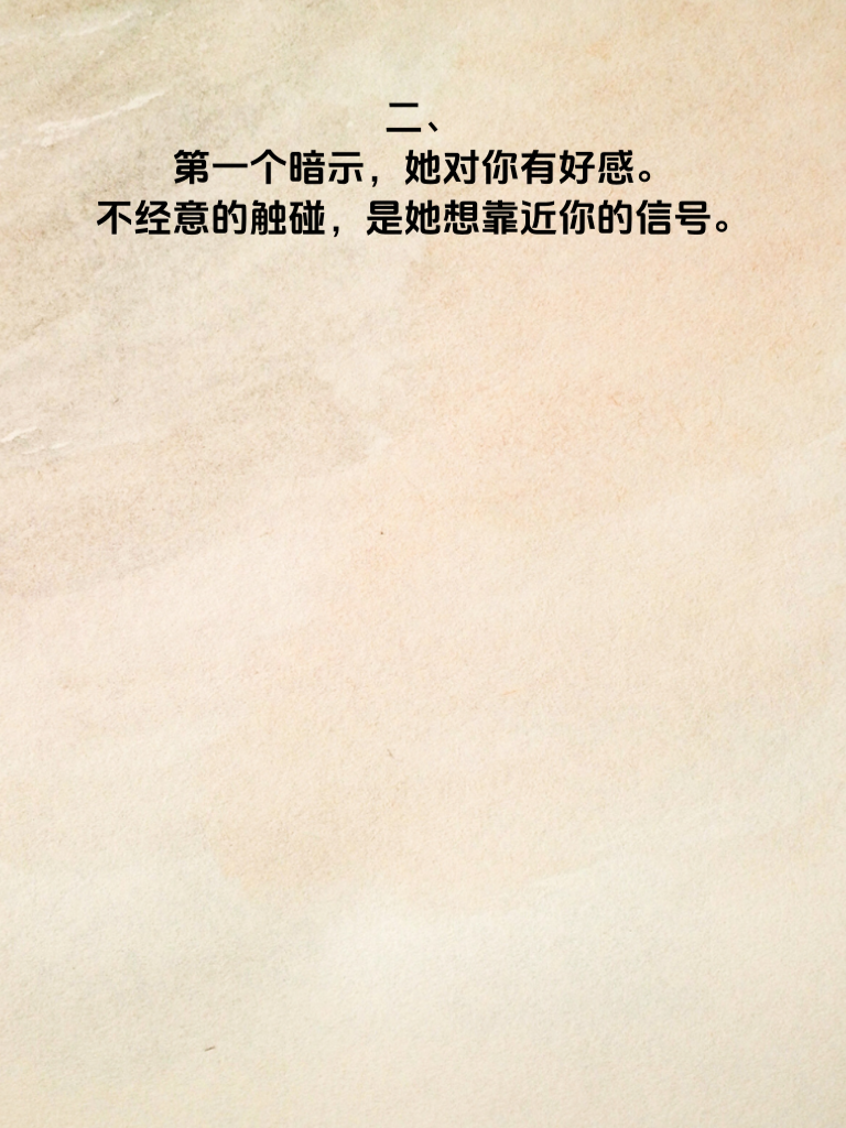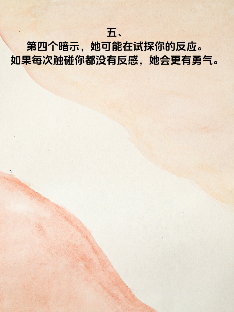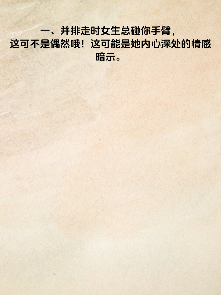 一、并排走时女生总碰你手臂,这可不是偶然哦!这可能是她内心深处的情感暗示。 二、第一个暗示,她对你有好感。不经意的触碰,是她想靠近你的信号。 三、第二个暗示,她在寻求安全感。通过碰手臂,仿佛在告诉你她需要你的陪伴。 四、第三个暗示,她渴望与你有更亲密的交流。肢体接触能拉近彼此的距离,让沟通更自然。 五、第四个暗示,她可能在试探你的反应。如果每次触碰你都没有反感,她会更有勇气。 六、第五个暗示,她希望和你更近一步。这是她发出的邀约,等待你有所行动。 七、所以,当女生碰你手臂时,别再傻傻不懂啦!抓住机会,或许一段美好的恋情就此开始。