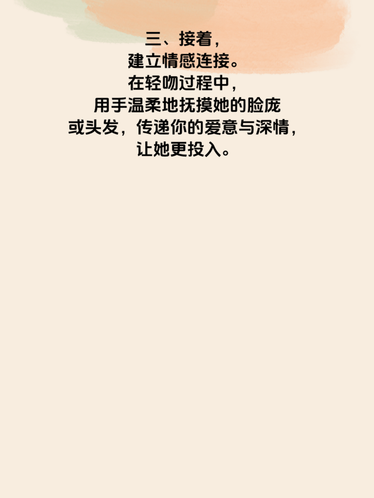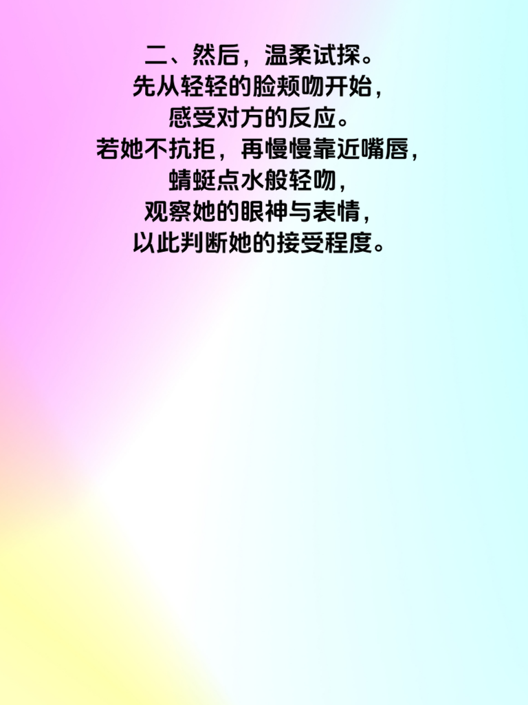 一、从轻吻到深吻,是情感升温的美妙旅程。首先,要营造浪漫氛围。选个温馨的环境,如静谧的公园或柔和灯光的室内,让彼此身心放松。 二、然后,温柔试探。先从轻轻的脸颊吻开始,感受对方的反应。若她不抗拒,再慢慢靠近嘴唇,蜻蜓点水般轻吻,观察她的眼神与表情,以此判断她的接受程度。 三、接着,建立情感连接。在轻吻过程中,用手温柔地抚摸她的脸庞或头发,传递你的爱意与深情,让她更投入。 四、最后,水到渠成地加深吻。当感觉彼此情感交融,逐渐加大力度与深度,但要注意节奏,别过于急切。让这个吻成为你们关系升级的甜蜜催化剂,让她心跳漏拍,自然地拉近你们的距离,开启更亲密的篇章。记住,一切都要基于双方的舒适与自愿,这样才能让这个进阶技巧发挥最佳效果,让爱情甜蜜绽放。