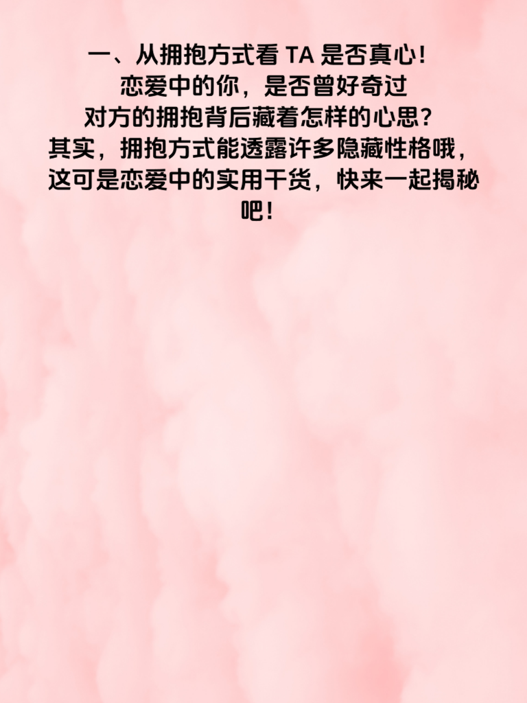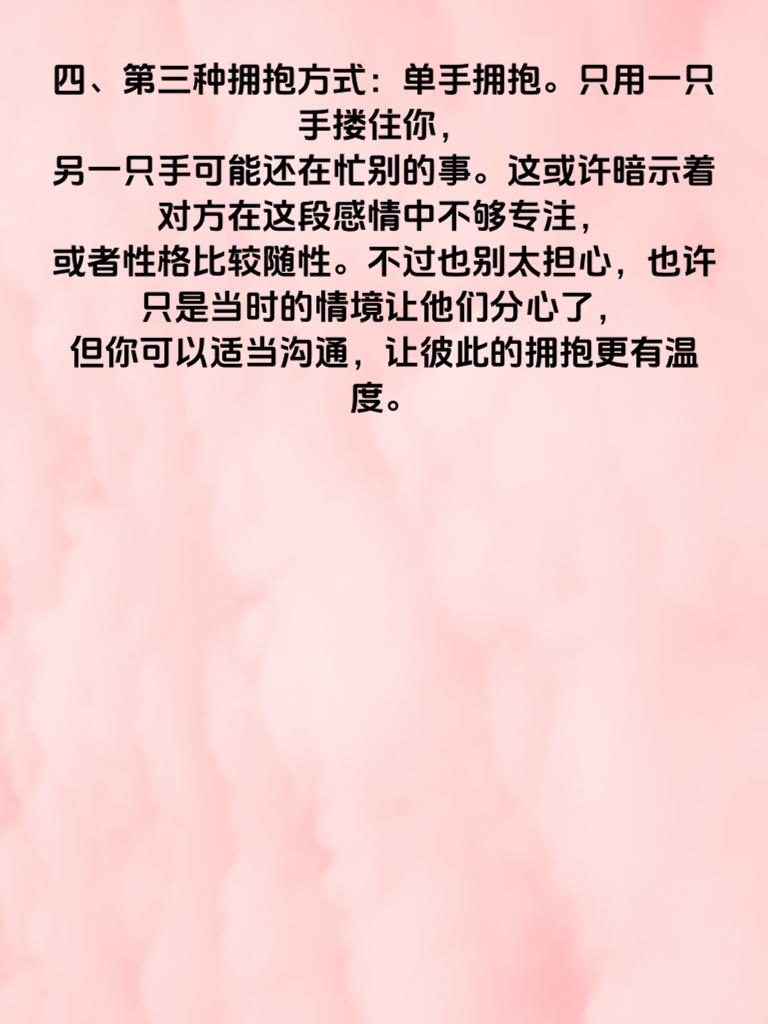 一、从拥抱方式看 TA 是否真心!恋爱中的你,是否曾好奇过对方的拥抱背后藏着怎样的心思?其实,拥抱方式能透露许多隐藏性格哦,这可是恋爱中的实用干货,快来一起揭秘吧! 二、第一种拥抱方式:紧紧相拥。这种拥抱力度大,仿佛要把对方揉进身体里。通常意味着对方在这段感情中投入了很多真心,渴望与你深度连接,内心缺乏安全感,所以想用这种方式感受你的存在,确认你的爱意。 三、第二种拥抱方式:轻轻环抱。双手只是轻轻搭在你背上,力度适中。这类人往往性格比较温和、理性,对待感情也比较细腻。他们的拥抱可能不会过于热烈,但却充满了体贴,在感情中注重彼此的舒适与尊重。 四、第三种拥抱方式:单手拥抱。只用一只手搂住你,另一只手可能还在忙别的事。这或许暗示着对方在这段感情中不够专注,或者性格比较随性。不过也别太担心,也许只是当时的情境让他们分心了,但你可以适当沟通,让彼此的拥抱更有温度。 五、恋爱中,这些拥抱方式的小秘密你掌握了吗?多留意对方的拥抱方式,能更好地了解彼此,让你们的感情之路更加顺畅甜蜜哦!