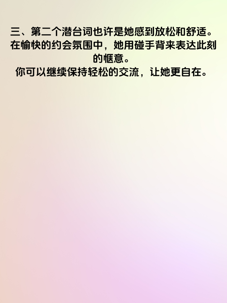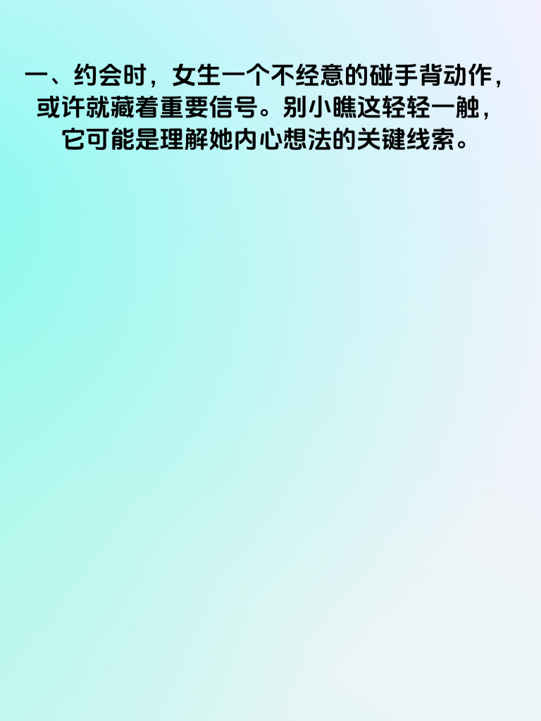 一、约会时,女生一个不经意的碰手背动作,或许就藏着重要信号。别小瞧这轻轻一触,它可能是理解她内心想法的关键线索。 二、第一个潜台词可能是她对你有好感。她通过这种肢体接触,想拉近与你的距离,试探你对她的态度。这时,你若也对她有意,不妨温柔回应,比如轻轻回握她的手,给她一些积极的反馈。 三、第二个潜台词也许是她感到放松和舒适。在愉快的约会氛围中,她用碰手背来表达此刻的惬意。你可以继续保持轻松的交流,让她更自在。 四、第三个潜台词说不定是她在寻求安全感。比如在陌生环境或遇到小紧张时,她下意识地碰你手背。你要及时给予她安心的感觉,轻声安慰或用行动让她知道你会保护她。 五、所以,男生们,当约会时女生突然碰你手背,别再傻傻不懂啦。抓住这些潜台词,更好地把握你们之间的情感进展,让约会更加甜蜜美好。