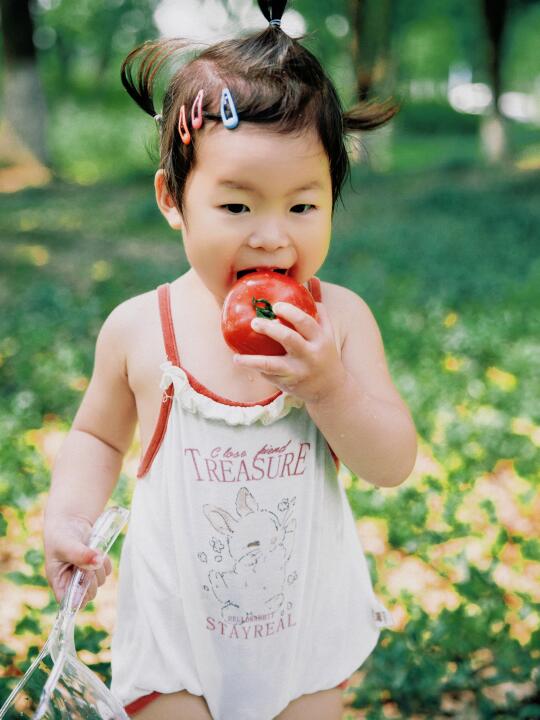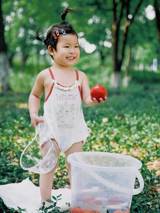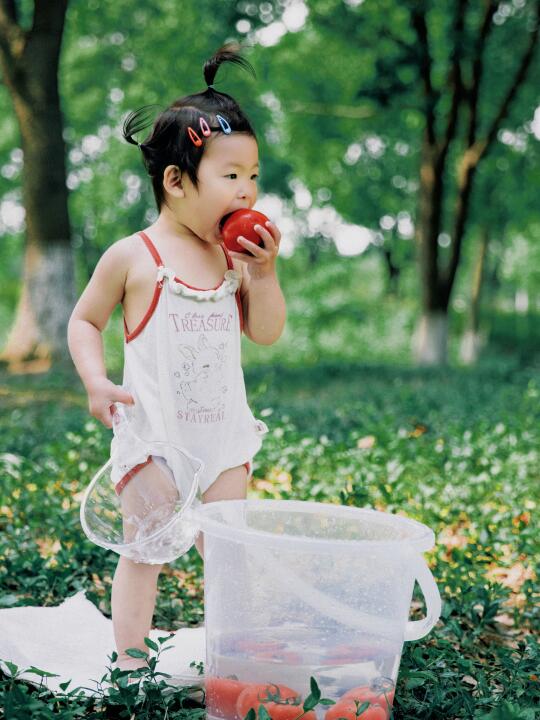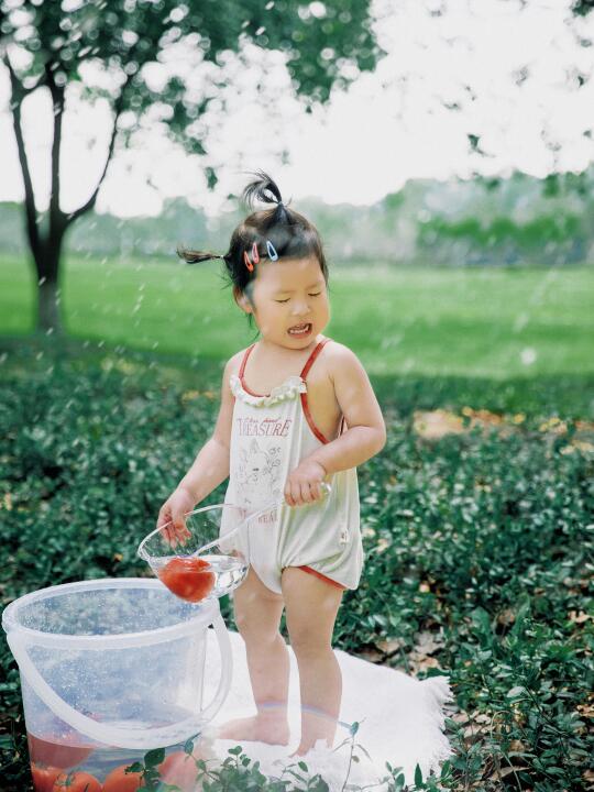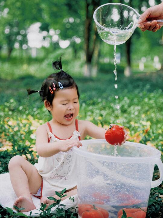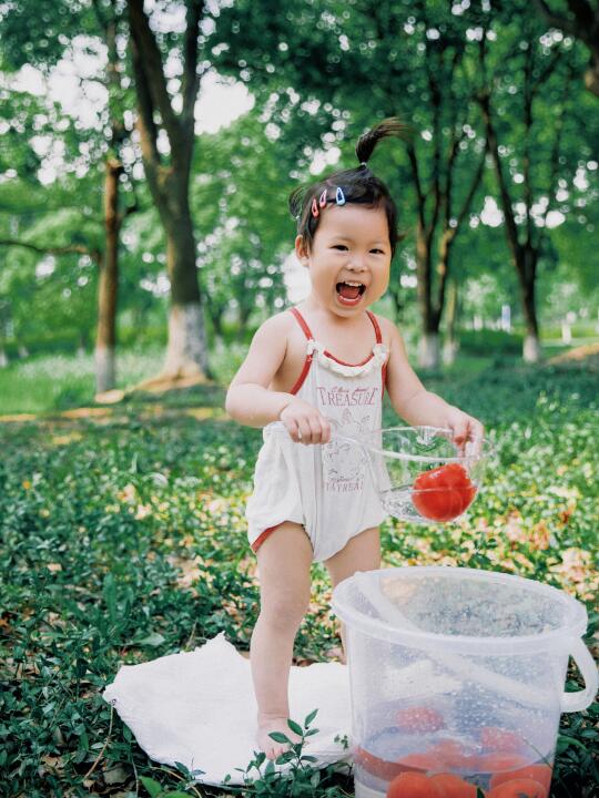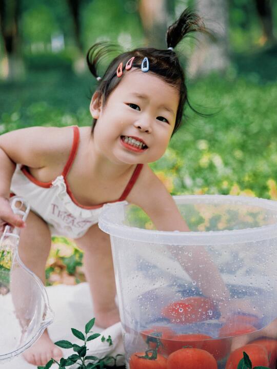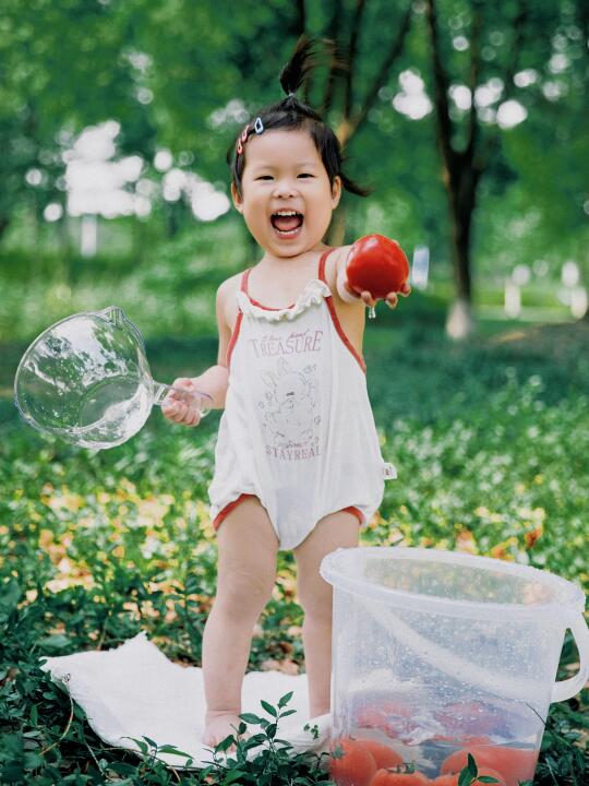 光脚丫踩碎一池碎钻, 番茄汁沾着两岁夏天。 水花把彩虹种进酒窝, 阳光在条纹衫上撒糖💦🍅