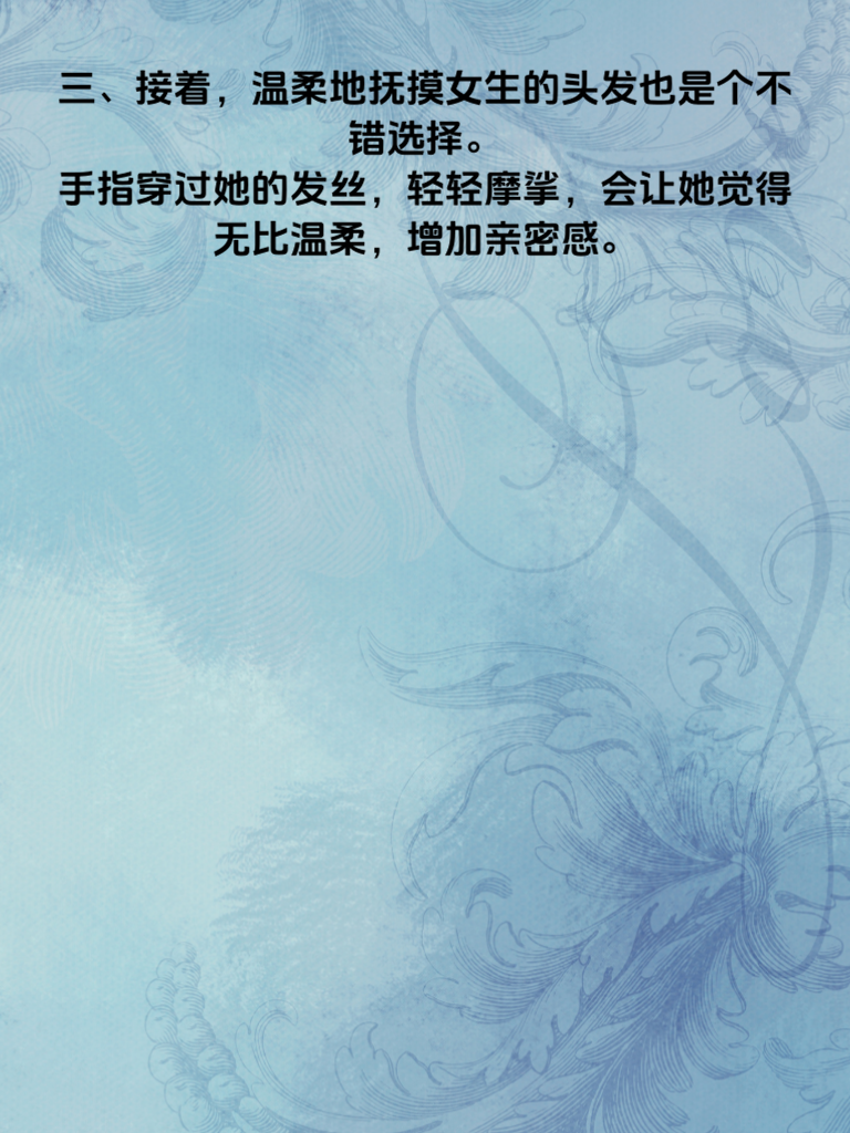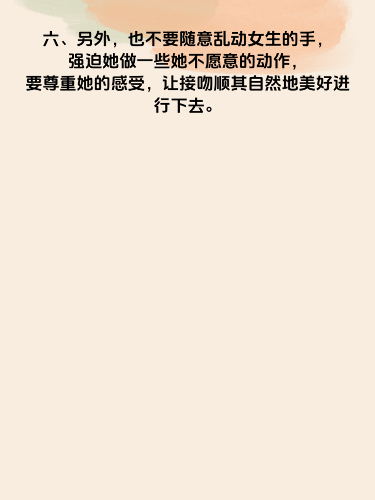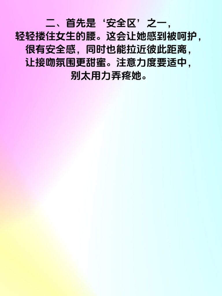一、接吻是情侣间超美妙的时刻,可不少男生会纠结接吻时手该放哪儿。今天就给大家讲讲男生必知的 3 个‘安全区’和 2 个‘危险区’。 二、首先是‘安全区’之一,轻轻搂住女生的腰。这会让她感到被呵护,很有安全感,同时也能拉近彼此距离,让接吻氛围更甜蜜。注意力度要适中,别太用力弄疼她。 三、接着,温柔地抚摸女生的头发也是个不错选择。手指穿过她的发丝,轻轻摩挲,会让她觉得无比温柔,增加亲密感。 四、还有,将手放在女生的脸颊两侧,用拇指轻轻摩挲她的脸颊,能让她感受到你的深情,也是很安全且浪漫的放置方式。 五、说完‘安全区’,讲讲‘危险区’。千万别贸然去摸女生的臀部,这会让她觉得很不舒服,甚至可能引起反感。 六、另外,也不要随意乱动女生的手,强迫她做一些她不愿意的动作,要尊重她的感受,让接吻顺其自然地美好进行下去。