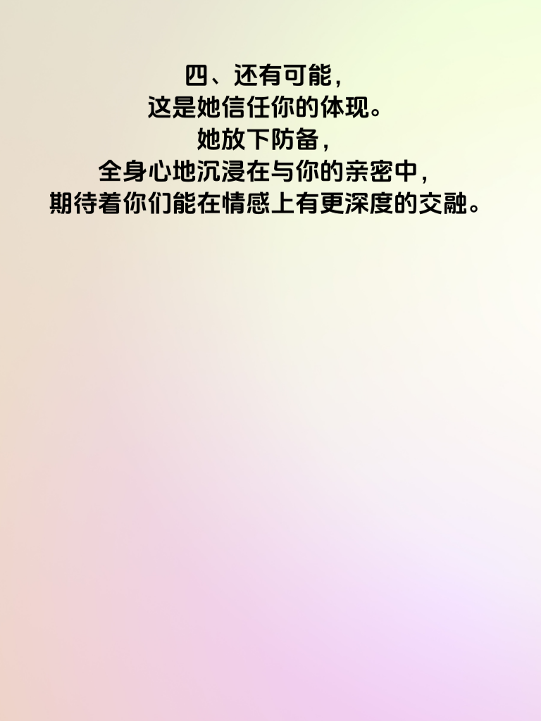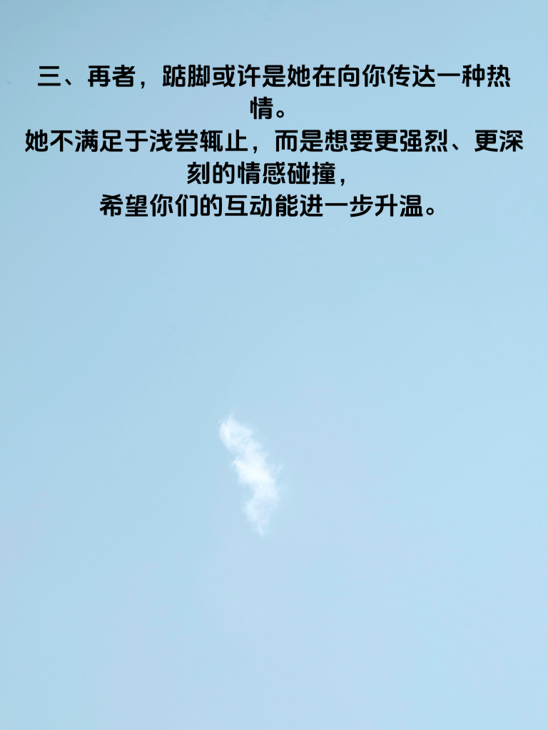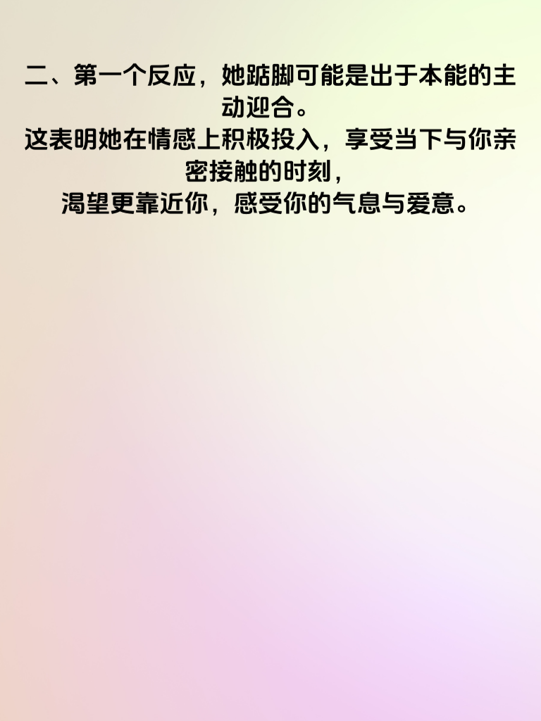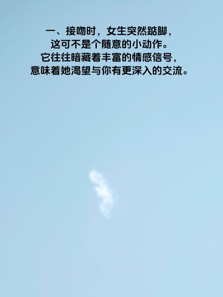一、接吻时,女生突然踮脚,这可不是个随意的小动作。它往往暗藏着丰富的情感信号,意味着她渴望与你有更深入的交流。 二、第一个反应,她踮脚可能是出于本能的主动迎合。这表明她在情感上积极投入,享受当下与你亲密接触的时刻,渴望更靠近你,感受你的气息与爱意。 三、再者,踮脚或许是她在向你传达一种热情。她不满足于浅尝辄止,而是想要更强烈、更深刻的情感碰撞,希望你们的互动能进一步升温。 四、还有可能,这是她信任你的体现。她放下防备,全身心地沉浸在与你的亲密中,期待着你们能在情感上有更深度的交融。 五、当遇到这种情况,男生们要敏锐捕捉到这些信号。适时地给予回应,加深彼此的情感连接,让这段亲密关系朝着更美好的方向发展。