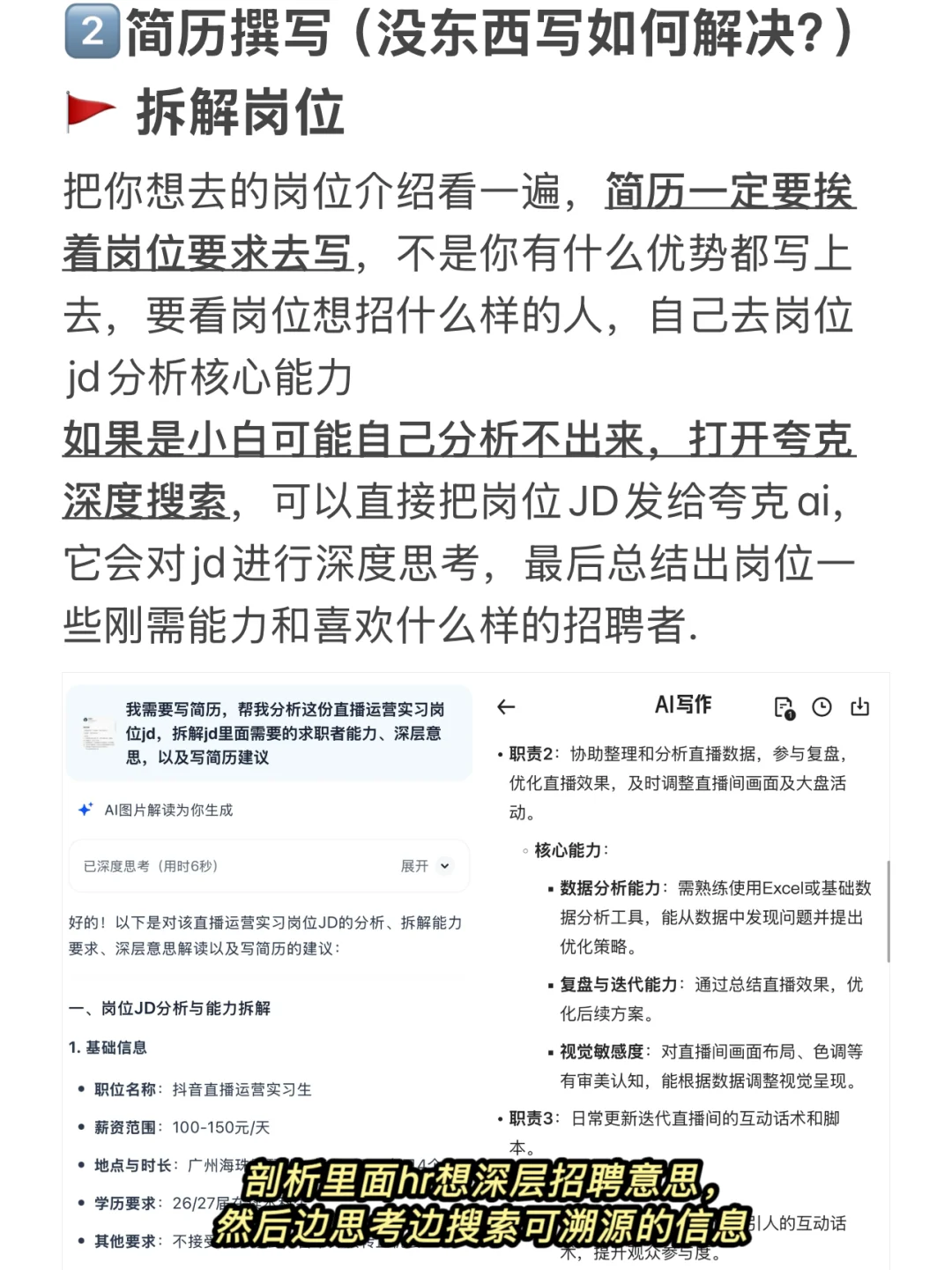 如果是小白可能自己分析不出来,打开夸克深度搜索,可以直接把岗位JD发给夸克ai,它会对jd进行深度思考,剖析里面hr想深层招聘意思,然后边思考边搜索可溯源的信息,最后总结出岗位一些刚需能力和喜欢什么样的招聘者.