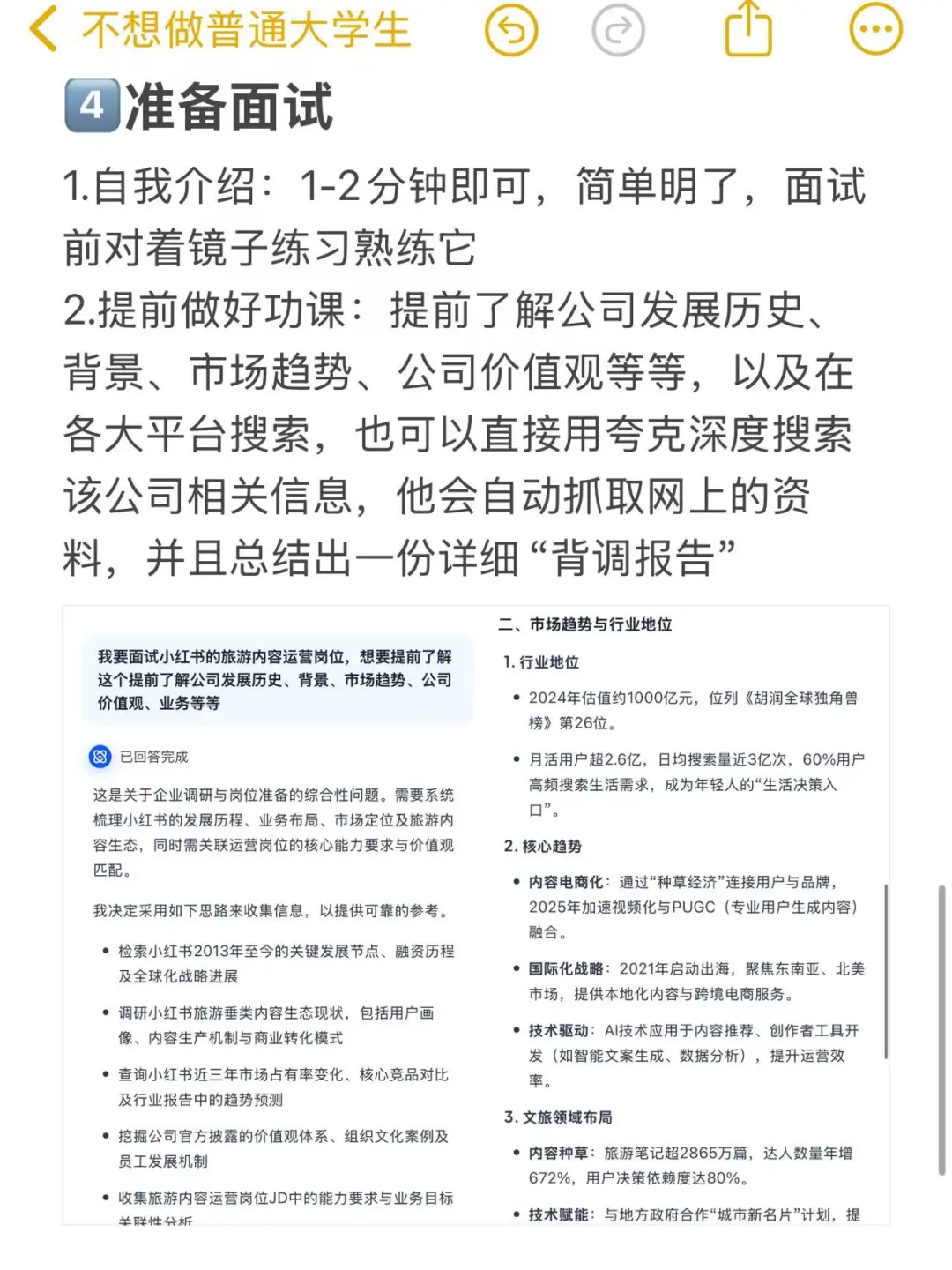 2.提前做好功课:提前了解公司发展历史、背景、市场趋势、公司价值观等等,以及在各大平台比如小【增加夸克深度搜索】