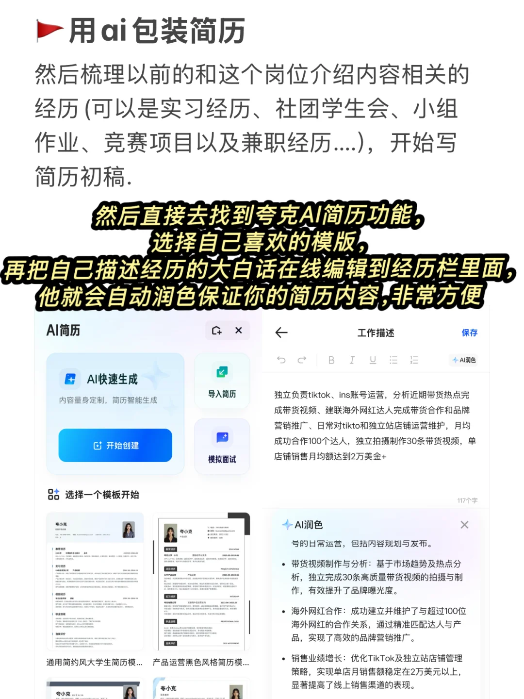 然后可以直接用夸克AI简历,在线编辑简历填入你的匹配经历,再点击AI润色,选择喜欢的模板直接生成简历