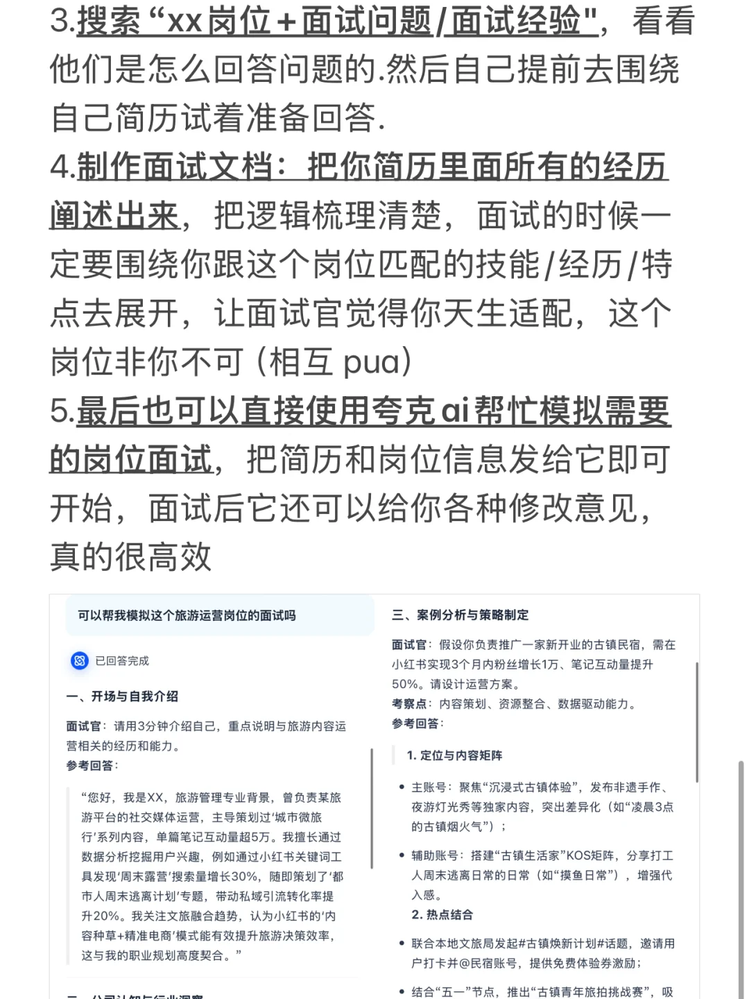 4.制作面试文档:把你简历里面所有的经历阐述出来,把逻辑梳理清楚,面试的时候一定要围绕你跟这个岗位匹配的技能/经历/特点去展开,让面试官觉得你天生适配,这个岗位非你不可(相互 pua)