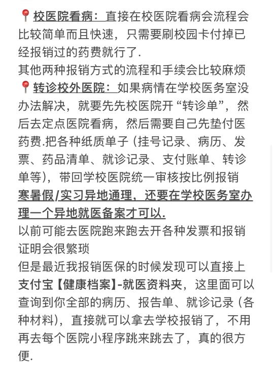 📍寒暑假/实习异地:提前报备校医院需要异地就医→在当地医保定点机构就诊→保存好各种证明票据