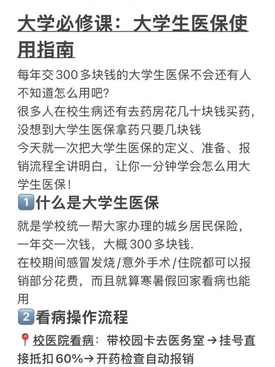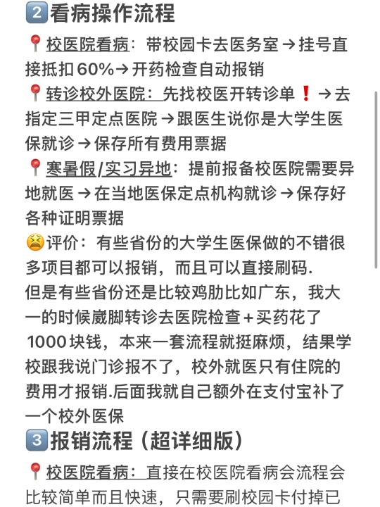 📍转诊校外医院:先找校医开转诊单❗️→去指定三甲定点医院→跟医生说你是大学生医保就诊→保存所有费用票据
