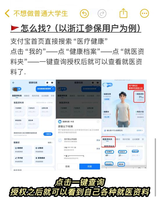 但是最近我报销医保的时候发现可以直接上支付宝【健康档案】-就医资料夹,这里面可以查询到你全部的病历、近6个月报告单、就诊记录(各种材料),直接就可以拿去学校报销了,不用再去每个医院小程序跳来跳去了,真的很方便.,而且材料也可以直接去把补充医疗保险也报销