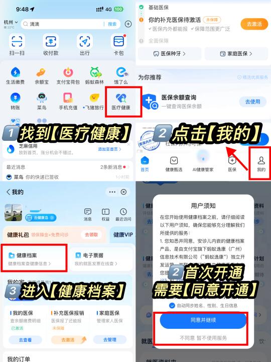 支付宝首页“医疗健康”-点“我的”,点“健康档案”