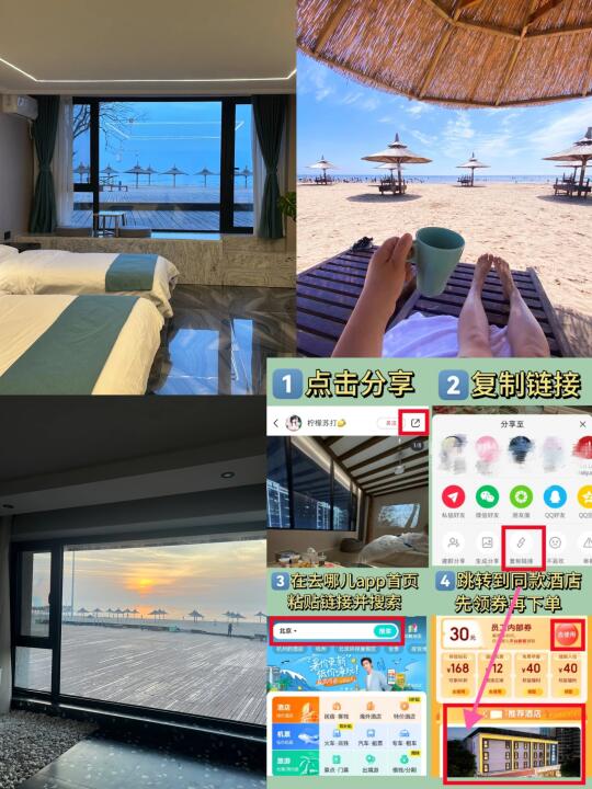 秦皇岛住宿真的很值!!就在沙滩边上,出门就是海! 交通也很便利,后边就是动物园。端午、周末来秦皇岛一定要住在这里!太美了下次还来! . ✅出门就是沙滩和大海,适合带孩子来赶海;马路对面就是秦皇岛野生动物园南门,步行三百米就能到;往南走就是北戴河湿地和鸽子窝公园! 附近公交站:野生动物园站(34路、北戴河观光巴士) . ✅酒店就在沙滩边上,带孩子随时随地去沙滩玩,直接走回来洗脚(房型有很多种:木屋房、榻榻米、复式、海景选择更适合自己的房型)房间是全景落地窗,傍晚可以在房间看夕阳! . ✅前台非常热情,有求必应,有什么问题解决的也都很快;大厅有自助售卖机东西便宜,不用担心在景区东西贵的问题.酒店可以免费停车,免费提供赶海小工具;有接送服务有需要可以提前联系 . ⭕酒店怎么定: 1.复制笔记链接到 去哪儿旅行app 2.粘贴到首页搜索框搜索(参考图5) 3.这样就可以领券定到这家酒店啦 (不会的宝宝可以在评论区问看到就回哦) Ps:偷偷要到了内部员工的专属优惠券!!!只有按照上述方法订酒店才会有额外优惠哦~ . 图文已全部授权请不要误判!