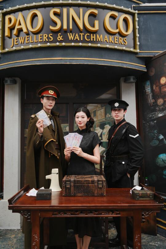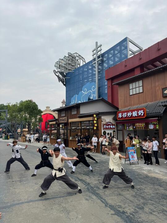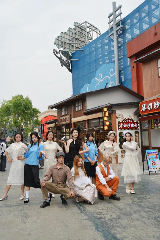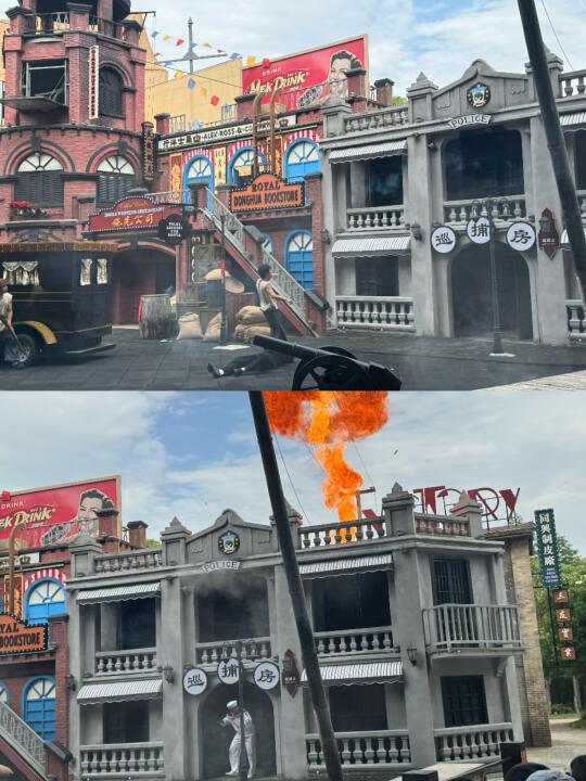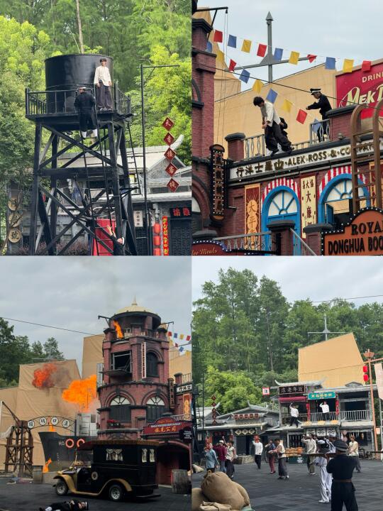 可能会遇到穿着民国服装的NPC在街头互动,乞讨的、卖报的、巡街的... 代入感超强!码头小镇不算特别大,但细节多,适合慢慢逛、细细拍。把它作为欢乐谷刺激项目之间的缓冲休息区,或者专程来拍照打卡都很棒。