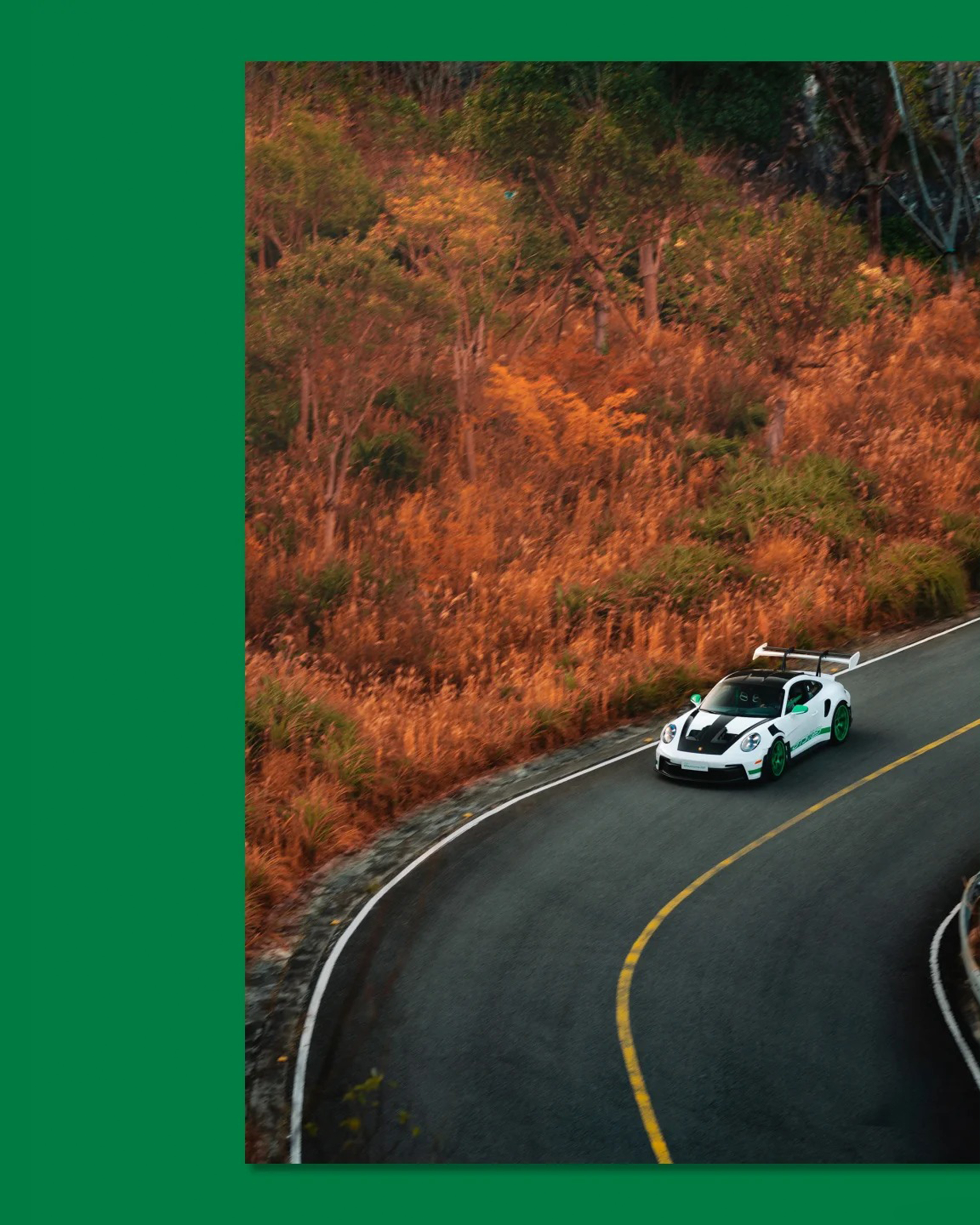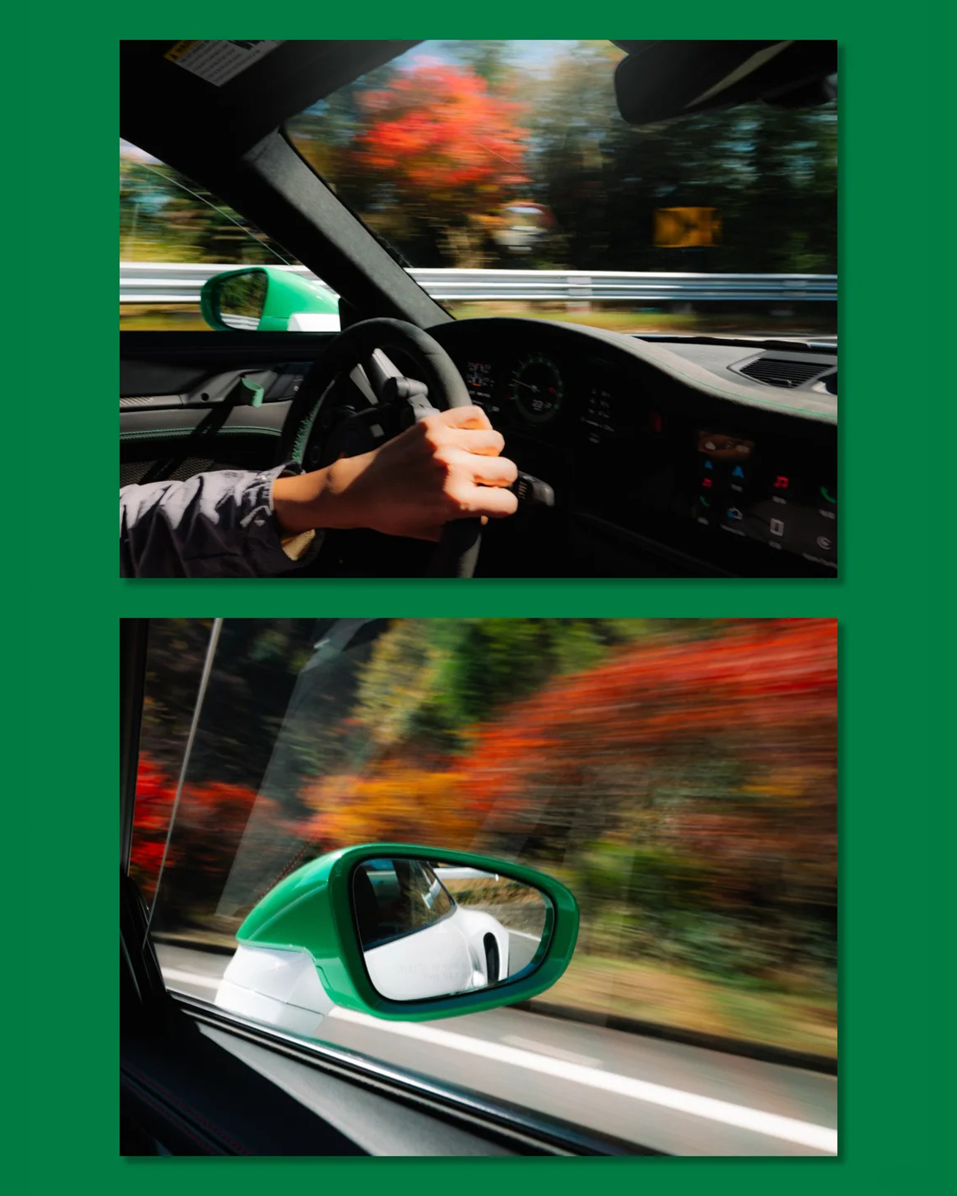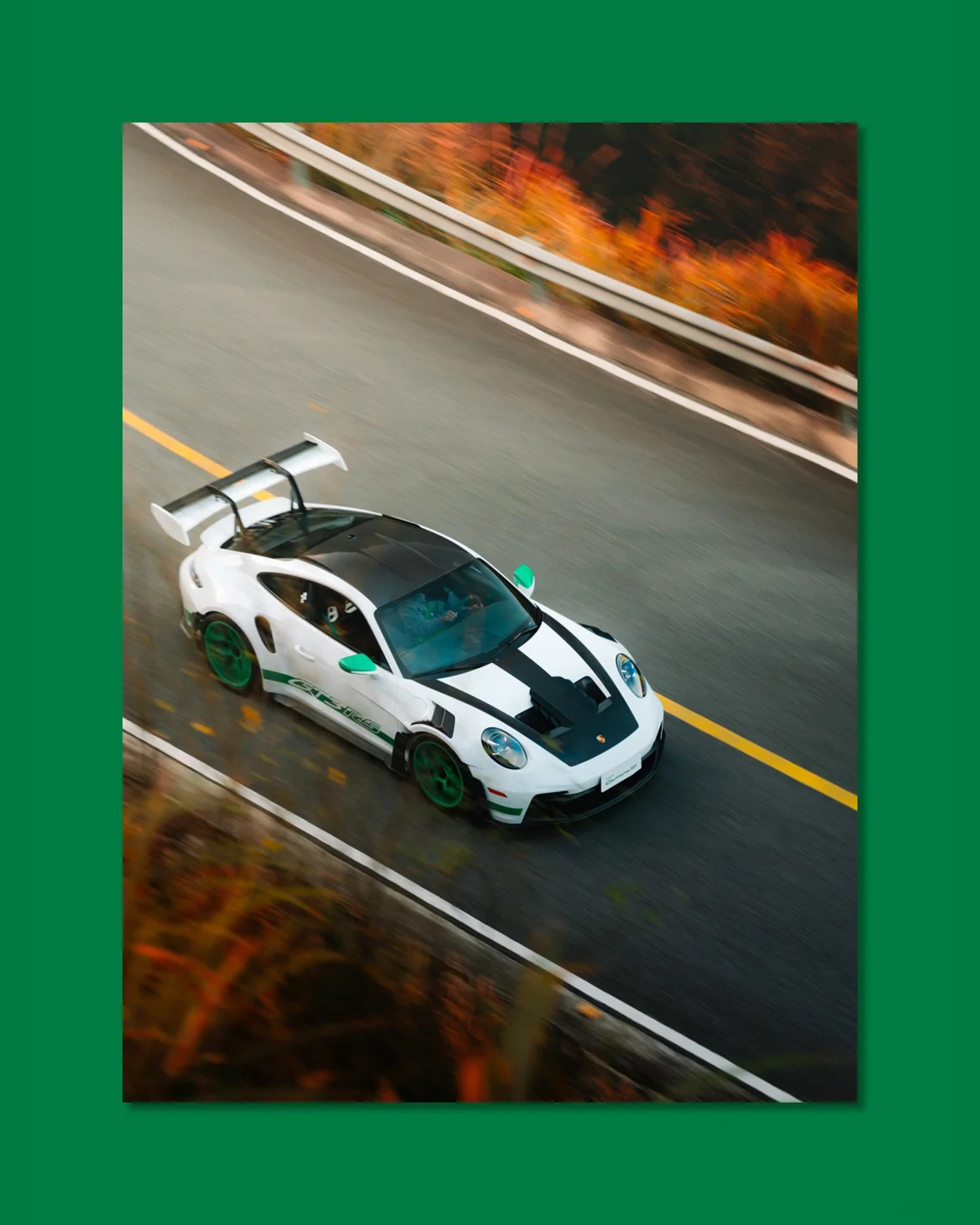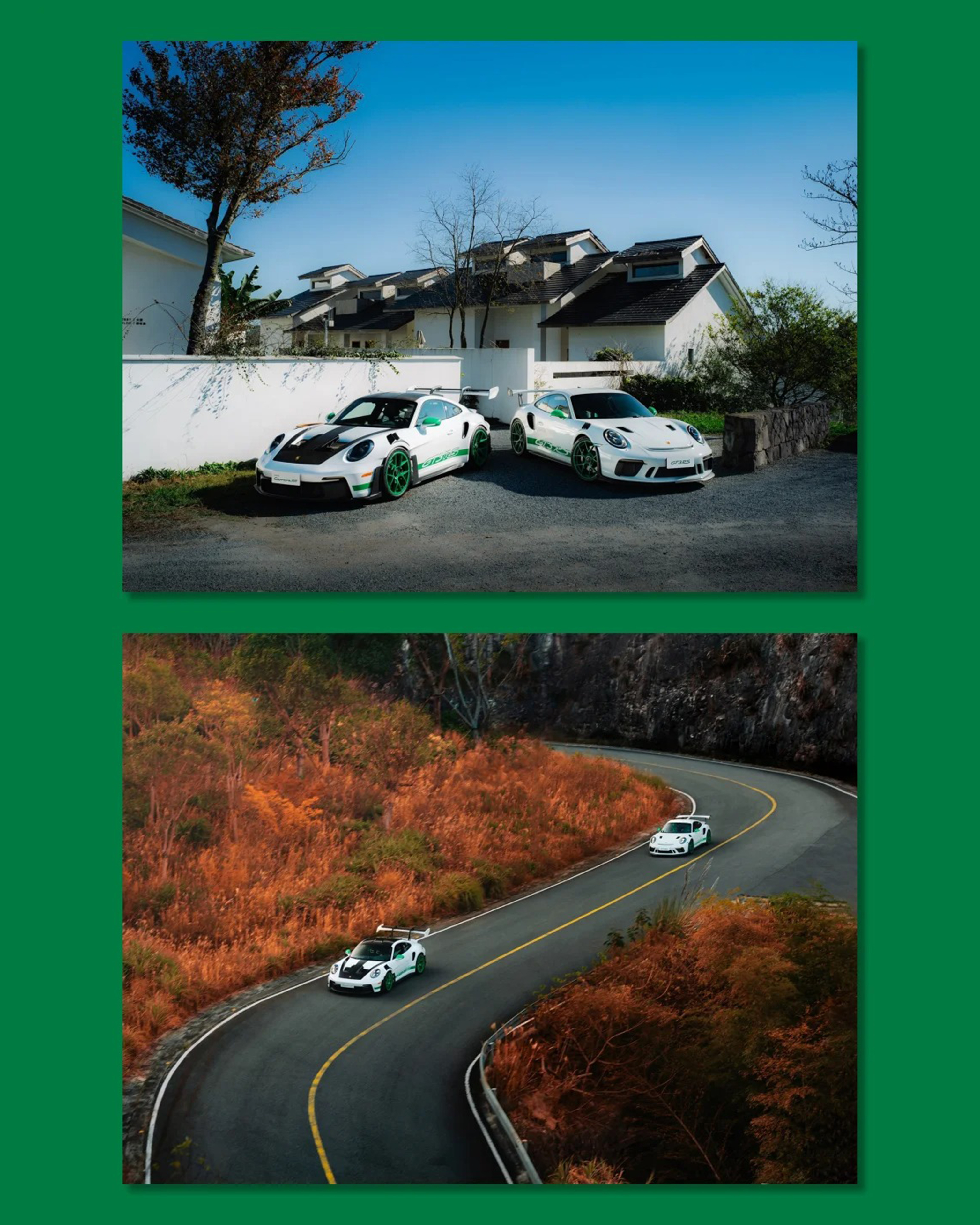相同Spec的992.1 GT3 RS与991.2 GT3 RS一起跑山,两台车都是白色车身绿拉花绿轮毂,同时都选了黑卡钳以避免出现任何的颜色干扰。