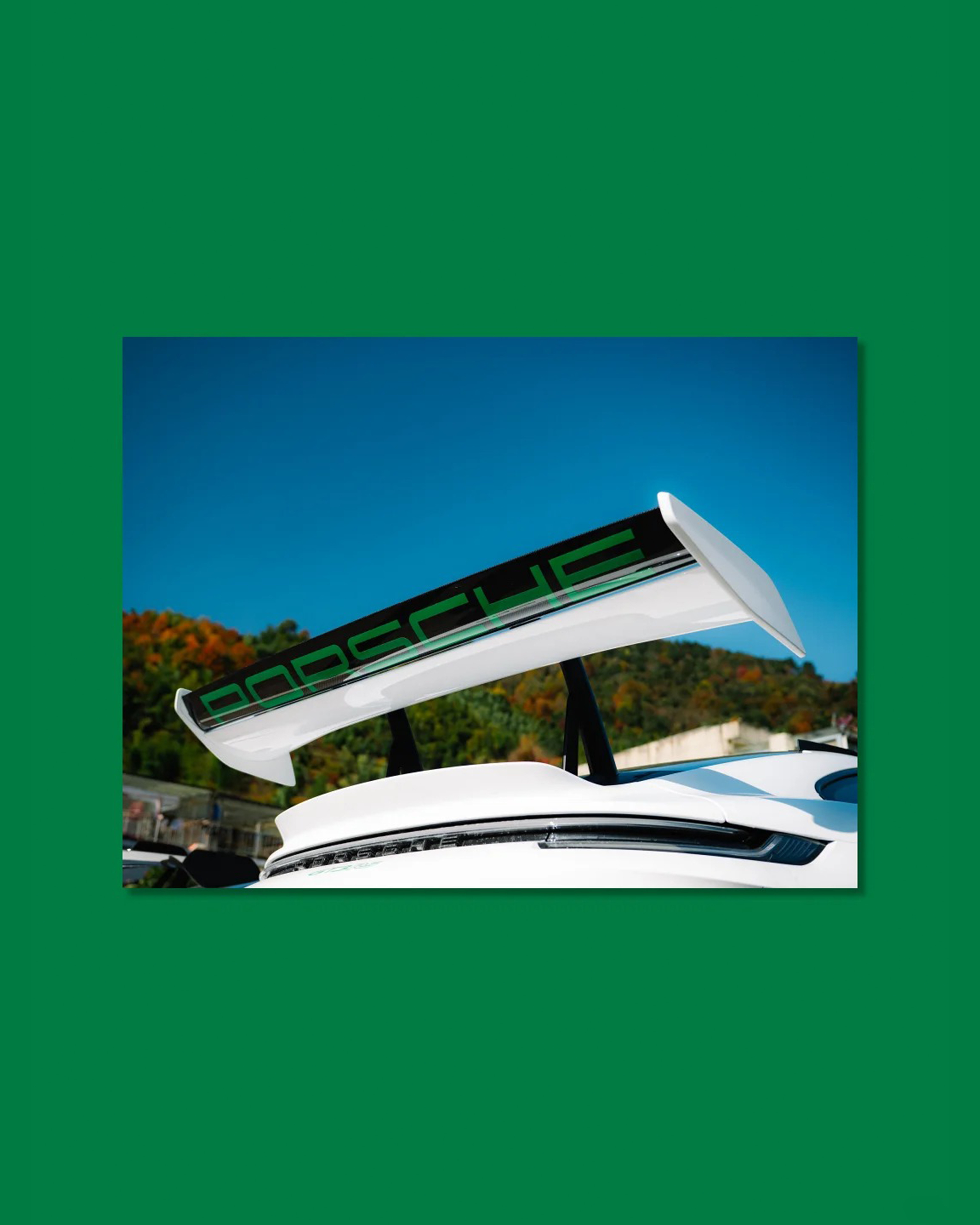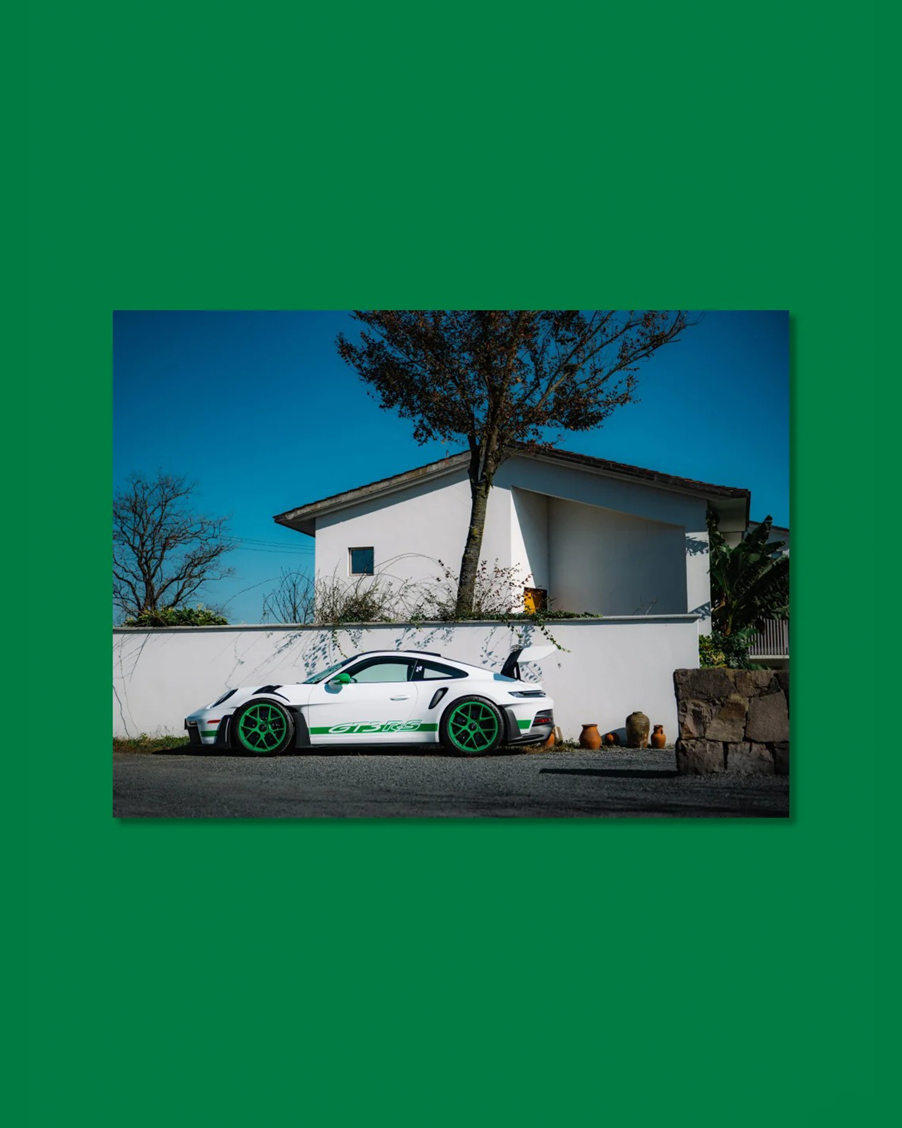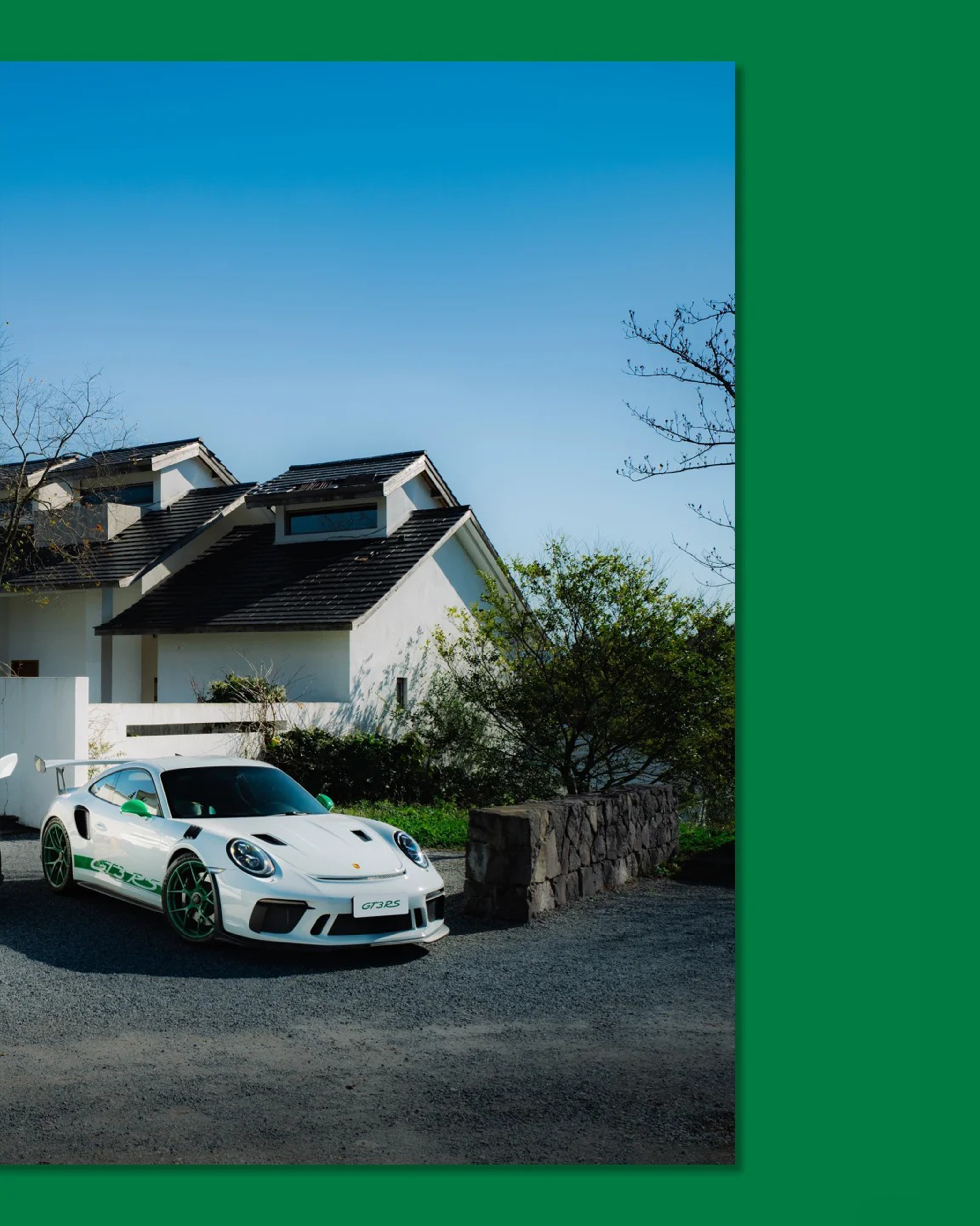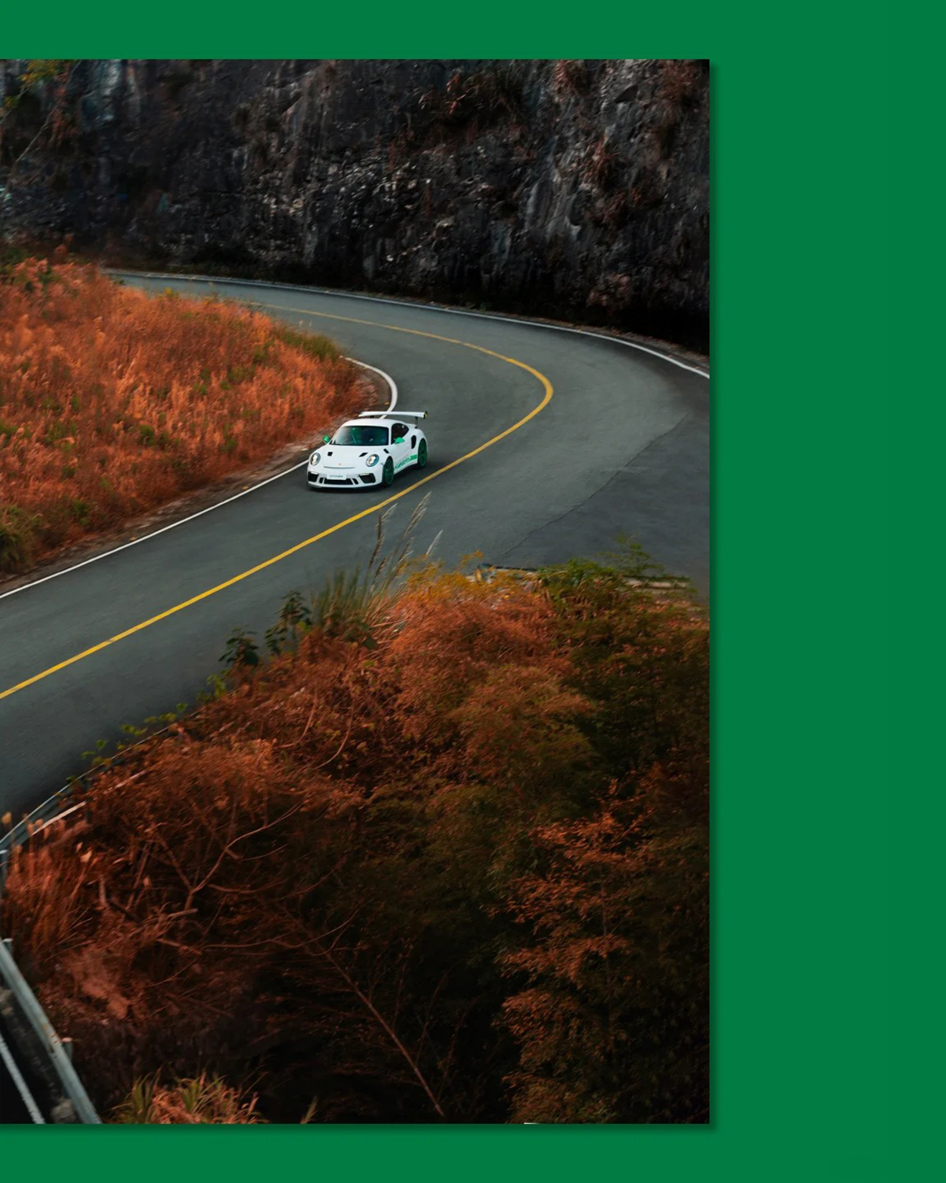 相同Spec的992.1 GT3 RS与991.2 GT3 RS一起跑山,两台车都是白色车身绿拉花绿轮毂,同时都选了黑卡钳以避免出现任何的颜色干扰。