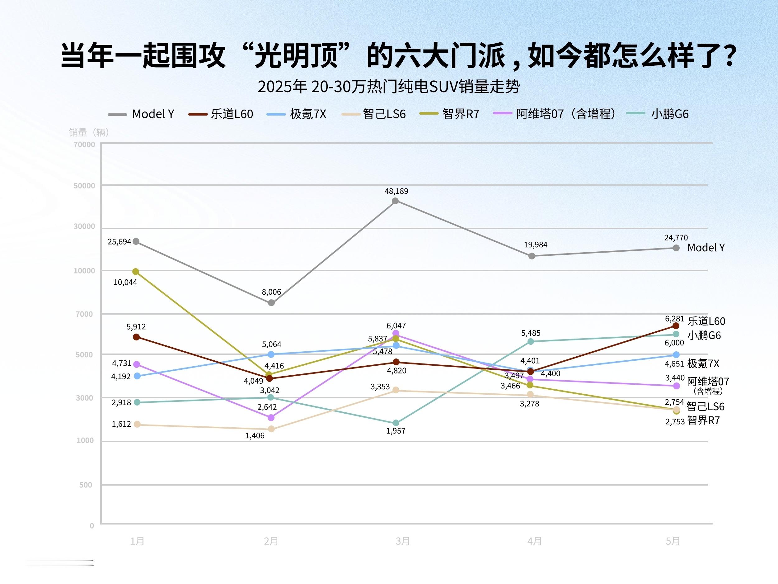 当时大家讨论得热火朝天,没想到从2025年开始,各个品牌的销量走势都有不同程度的下滑,特斯拉还是太强了!