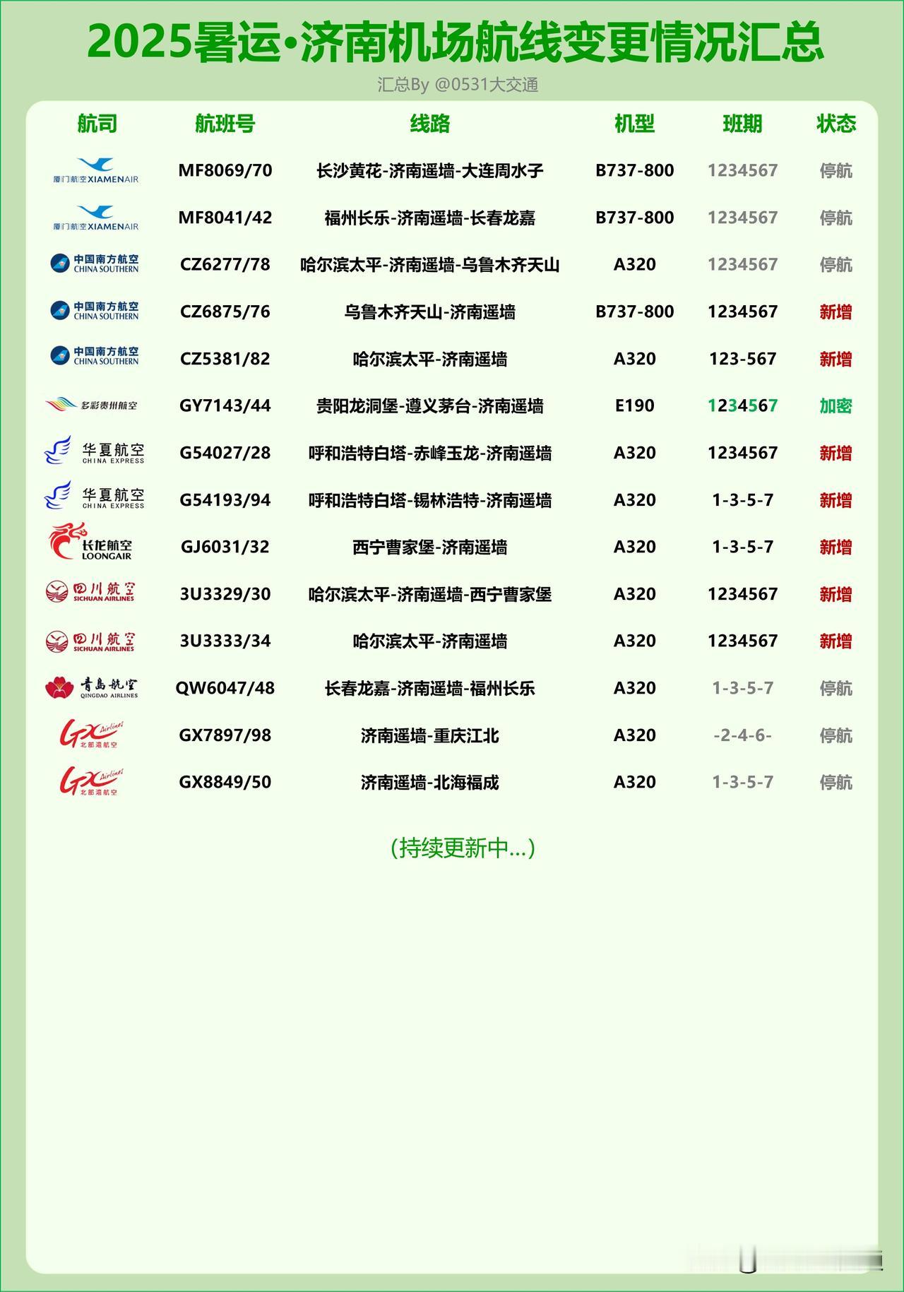 今天周末,给大家做一个2025暑运期间济南机场的航线调整信息汇总吧——UP之前也写了好多暑运航线的推文,但济南机场好歹也是个2000w量级的机场,暑运期间涉及的航线调整还是比较繁杂的,很难有精力把每条航线都介绍一遍,所以这里UP用表格汇总一下暑运期间济南机场的航线增减情况[狗头][狗头]。 暑运期间济南机场新增长白山、赤峰、海拉尔航点,停航齐齐哈尔、佳木斯、北海航点[机智][机智];济南至海拉尔、呼和浩特、银川航线每日航班增量超过3班,济南至哈尔滨、西宁航线每日增加2班,而济南飞上海、长沙、长春、福州等航线则出现较大幅度的下降[无辜笑][无辜笑]。 很多机场都会以"暑运期间XX机场开通、加密航线XX条"的话术进行宣传,但事实上,大多数情况新增航线的同时都会停飞另一条航线[大笑][大笑],虽然暑运期间航司肯定会尽可能挖掘运力,但因为飞机数量毕竟有限,很多航线事实上反而要旺季停运,所以这里我们也列出了暑运期间济南机场的停运航线,可以帮大家更好的了解运力变化情况[奸笑][奸笑]