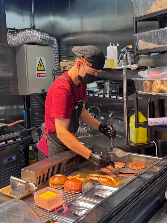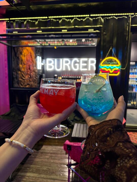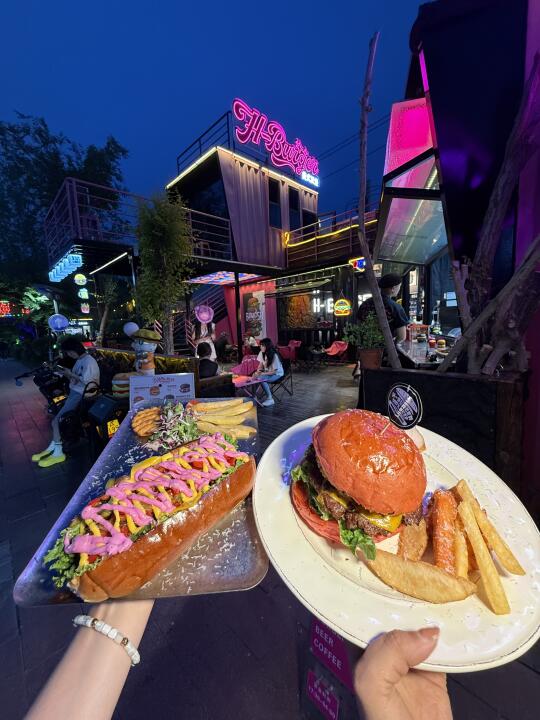 谁懂啊!在乌鲁木齐超绝美式汉堡店🍔 粉粉的集装箱小屋,像把上海的那种潮流劲儿搬来了乌鲁木齐✨ 氛围感直接拉满! 一进门就被开放式厨房香晕🥩 现煎肉饼 真的香迷糊了💦🤤 🍔 招牌粉汉堡必点!松软面包夹着多汁牛肉,一口下去超满足,配的粗薯条蘸酱绝了~ 晚上🌃坐在露台吹吹风,吃着汉堡 不要太舒服💓