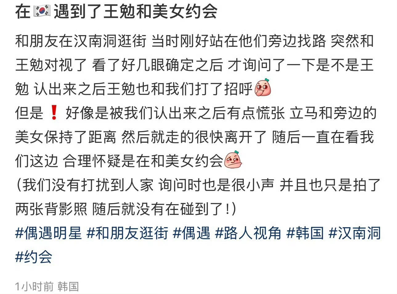 王勉和美女约会网友韩国偶遇王勉和美女约会!被认出来后还刻意保持距离,这是有新恋情了吗?[偷笑]韩国偶遇王勉和美女约会
