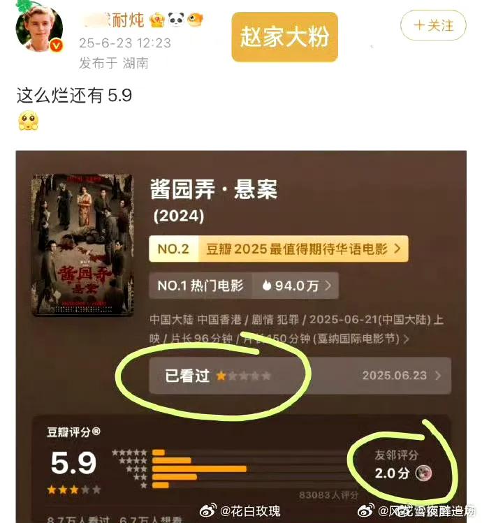 汪海林认为《酱园弄》豆瓣评分低是因为赵丽颖粉丝攻击电影的缘故。 电影《酱园弄》今日豆瓣开分5.9分,是目前陈可辛作品中评分最低的一部作品,对于这个分数,许多网友都认为该作品被人恶意打了低分。 后来许多人发现,打低分的用户大多是赵丽颖铁粉,赵丽颖因为在《酱园弄》里表现不佳,最近演技遭到质疑,可能赵丽颖粉丝气不过,这才跑去打了低分 。 汪海林在《酱园弄》点映的时候去看了该电影,当时就夸这是一部好电影。今天电影豆瓣开分5.9分,汪海林直接发文内涵该电影之所以评分低,是因为赵丽颖没能从该电影里获得好处,所以粉丝组织起来攻击《酱园弄》,这才导致该电影评分这么低。 你们认同汪海林的说法吗?你认为《酱园弄》 值多少分?酱园弄电影