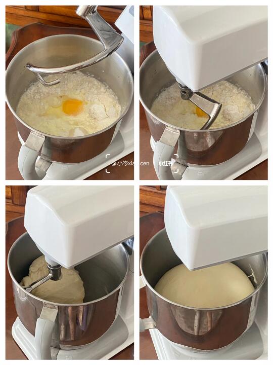 1.除盐和黄油以外的食材倒入揉面桶内,2-5档打至粗膜状态加盐和黄油,继续打面至完全扩展阶段,可以拉出较薄的手套膜即可。