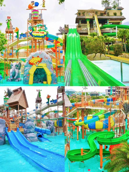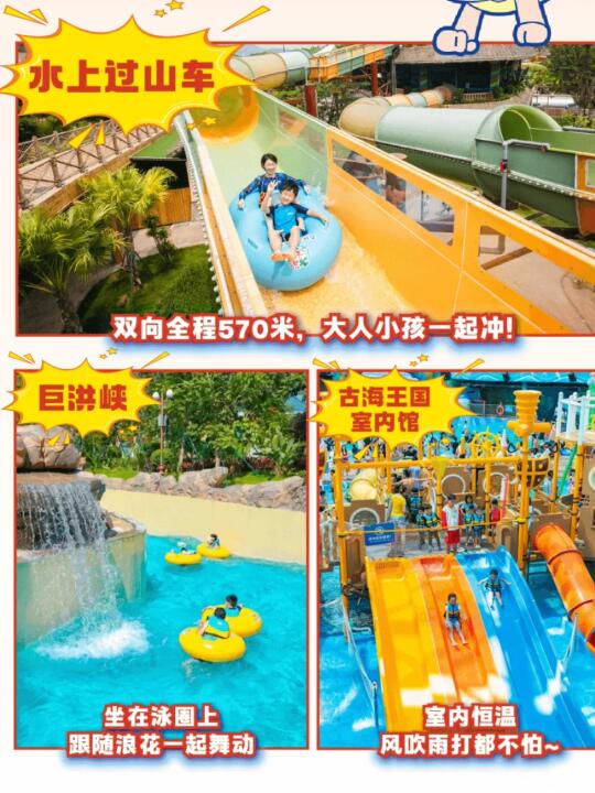 早上10:00椰林白沙滩(这个时候人比较少,可以随便拍)➡11:00天阳湖游船(人不多,享受包湖的体验)➡13:00古海王国(中午晒或者晚上玩也可以,室内馆营业至20:00)➡14:30抓鱼摸虾➡15:00水上过山车(从古海王国坐到尖峰极速,玩户外项目)➡15:30大水寨(各种组合滑梯)➡16:40漂流河➡17:30无边际泳池(赏风景看落日)➡20:00森林温泉(可以放在最后玩,23:30才关门)