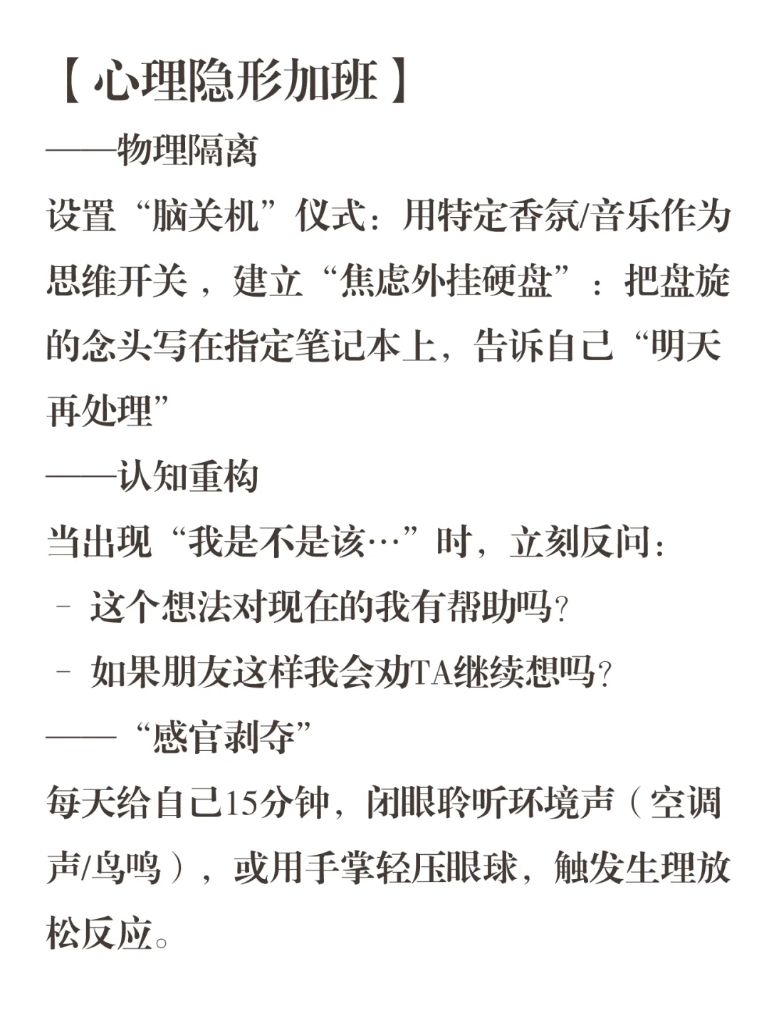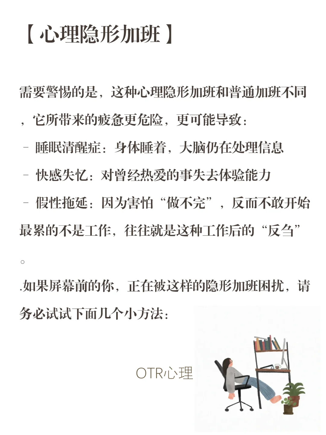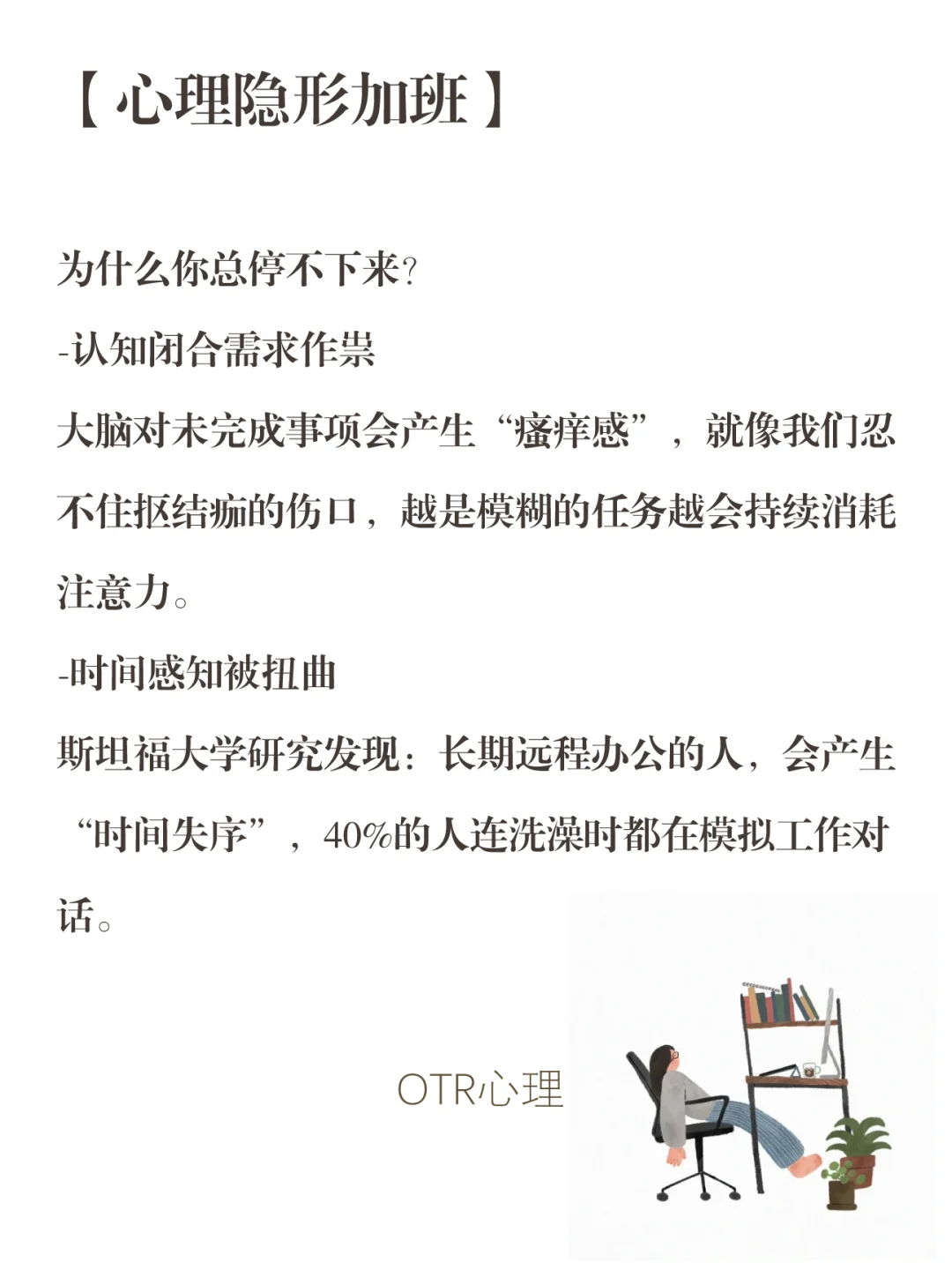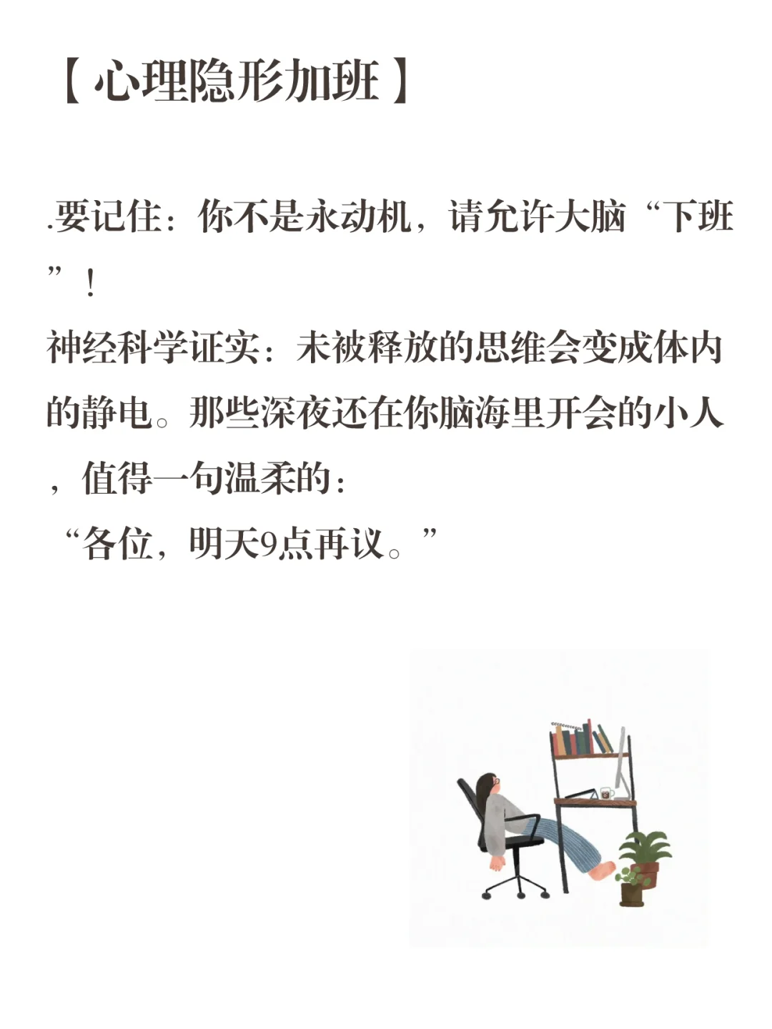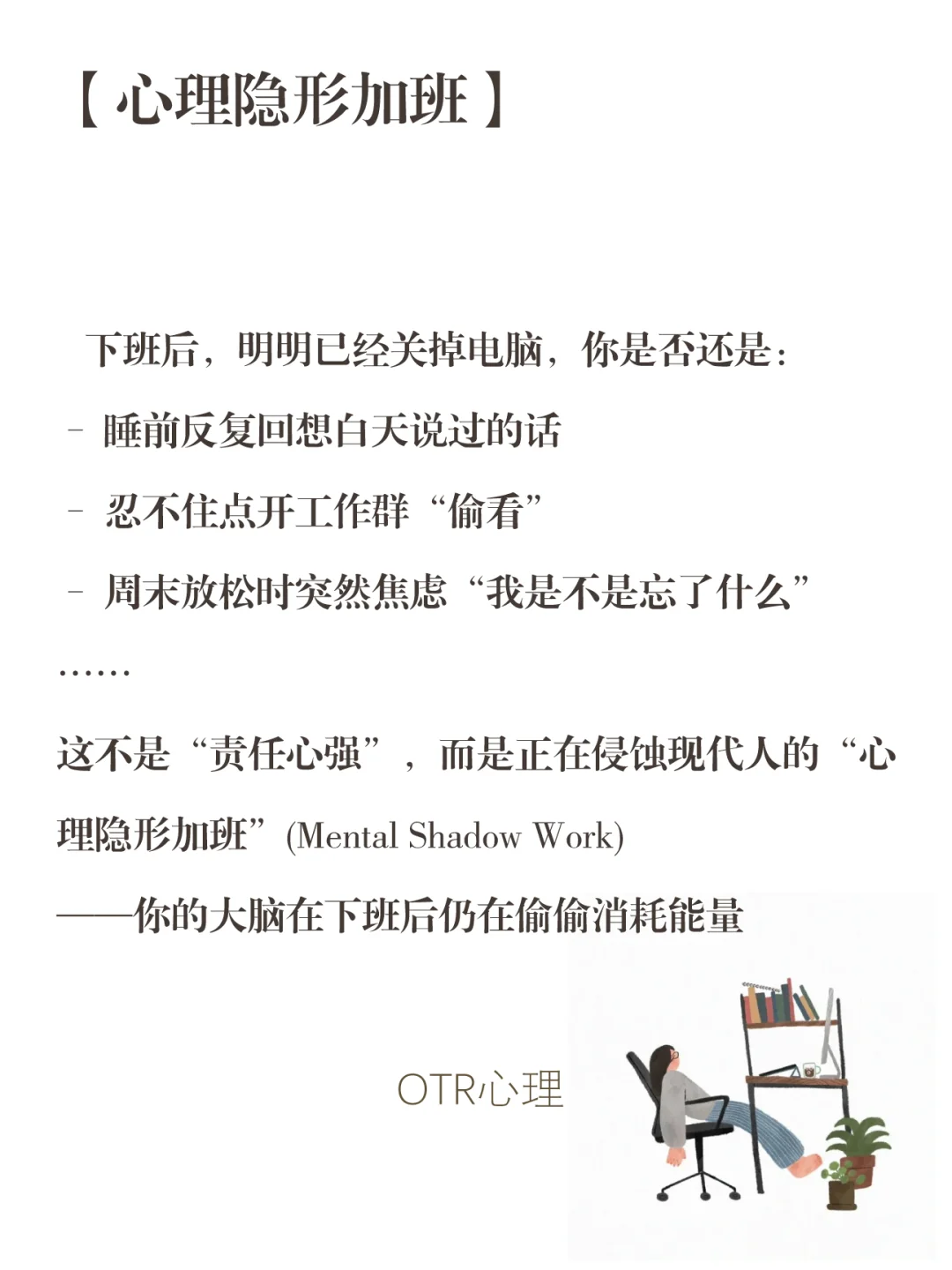 🔎下班后,明明已经关掉电脑,你是否还是: – 睡前反复回想白天说过的话 – 忍不住点开工作群“偷看” – 周末放松时突然焦虑“我是不是忘了什么” …… 这不是“责任心强”,而是正在侵蚀现代人的“心理隐形加班”(Mental Shadow Work) ——你的大脑在下班后仍在偷偷消耗能量💦 . 为什么你总停不下来? ▶️认知闭合需求作祟 大脑对未完成事项会产生“瘙痒感”,就像我们忍不住抠结痂的伤口,越是模糊的任务越会持续消耗注意力。 ▶️时间感知被扭曲 斯坦福大学研究发现:长期远程办公的人,会产生“时间失序”,40%的人连洗澡时都在模拟工作对话。 . ⚠️需要警惕的是,这种心理隐形加班和普通加班不同,它所带来的疲惫更危险,更可能导致: – 睡眠清醒症:身体睡着,大脑仍在处理信息 – 快感失忆:对曾经热爱的事失去体验能力 – 假性拖延:因为害怕“做不完”,反而不敢开始 🤦🏻‍♀️最累的不是工作,往往就是这种工作后的“反刍”。 . 如果屏幕前的你,正在被这样的隐形加班困扰,请务必试试下面几个小方法: 💡物理隔离 设置“脑关机”仪式:用特定香氛/音乐作为思维开关 建立“焦虑外挂硬盘”:把盘旋的念头写在指定笔记本上,告诉自己“明天再处理” 💡认知重构 当出现“我是不是该…”时,立刻反问: – 这个想法对现在的我有帮助吗? – 如果朋友这样我会劝TA继续想吗? 💡“感官剥夺” 每天给自己15分钟,闭眼聆听环境声(空调声/鸟鸣),或用手掌轻压眼球,触发生理放松反应。 . 🌟要记住:你不是永动机,请允许大脑“下班”! 神经科学证实:未被释放的思维会变成体内的静电。那些深夜还在你脑海里开会的小人,值得一句温柔的: “各位,明天9点再议。” 💤 .