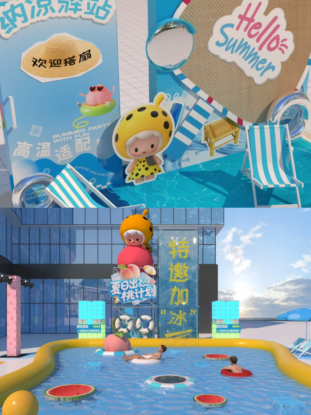 2⃣️吃喝足再到(5楼奇喵小镇)纳凉驿站和巨型蒲扇、巨型光狸IP夏日限定桃子皮肤一起拍拍泳衣🩱美照,🏖️🏖️,再到1号门外广场玩水消暑啦~~