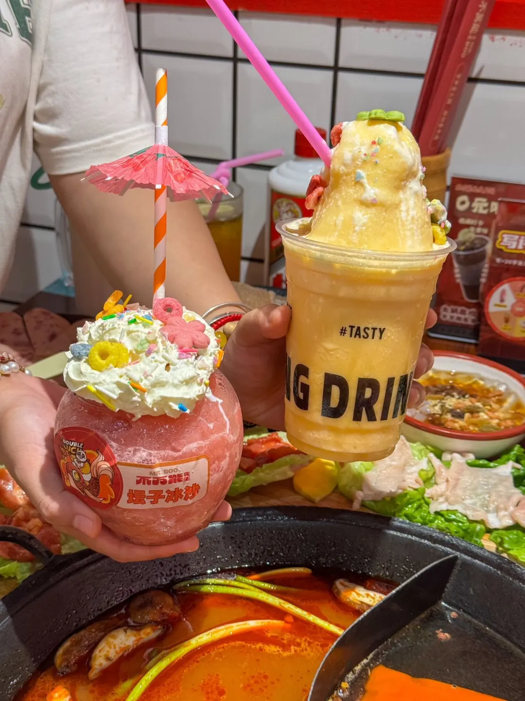 还有爆浆糍粑,外酥里嫩会爆汁,和颜值超高的芒果/草莓冰沙配一口,瞬间解辣又清爽,夏天火锅局yyds!