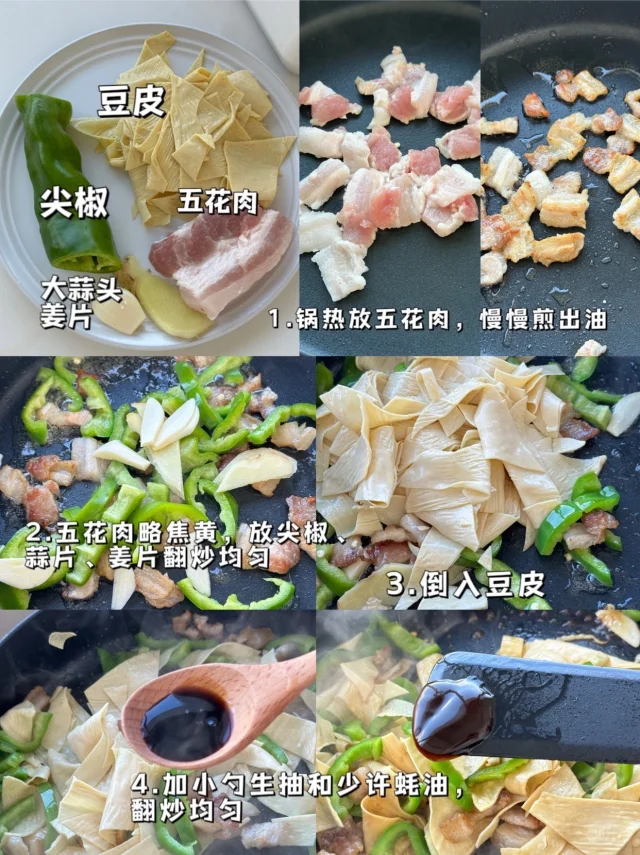 吃不了太辣,有辣椒基本上算点缀,今天拿尖椒炒的豆皮,微微辣能接受,五花肉一炒很下饭。如果要控制热量可以换五花肉为瘦肉。