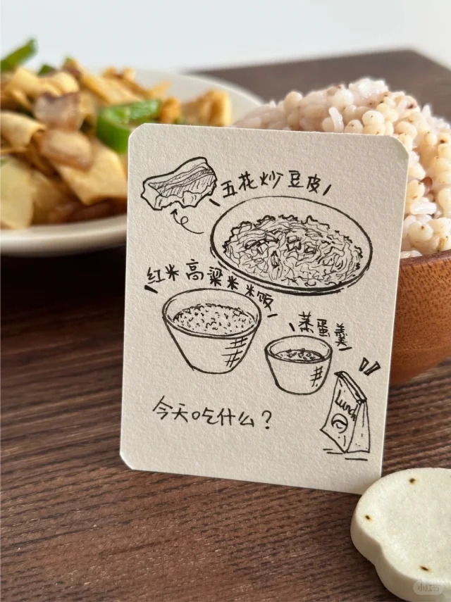 今日午餐:五花肉炒豆皮,蒸蛋羹,高粱米红米饭