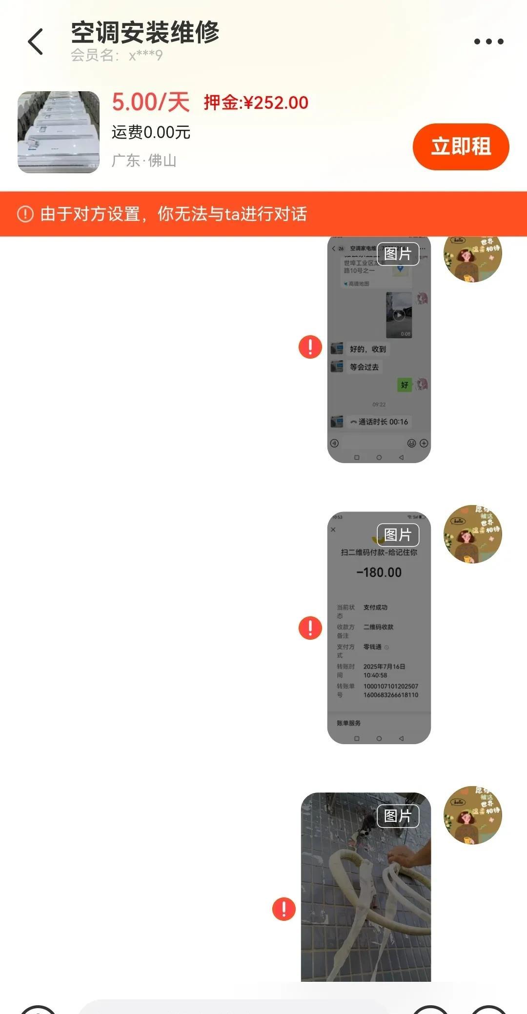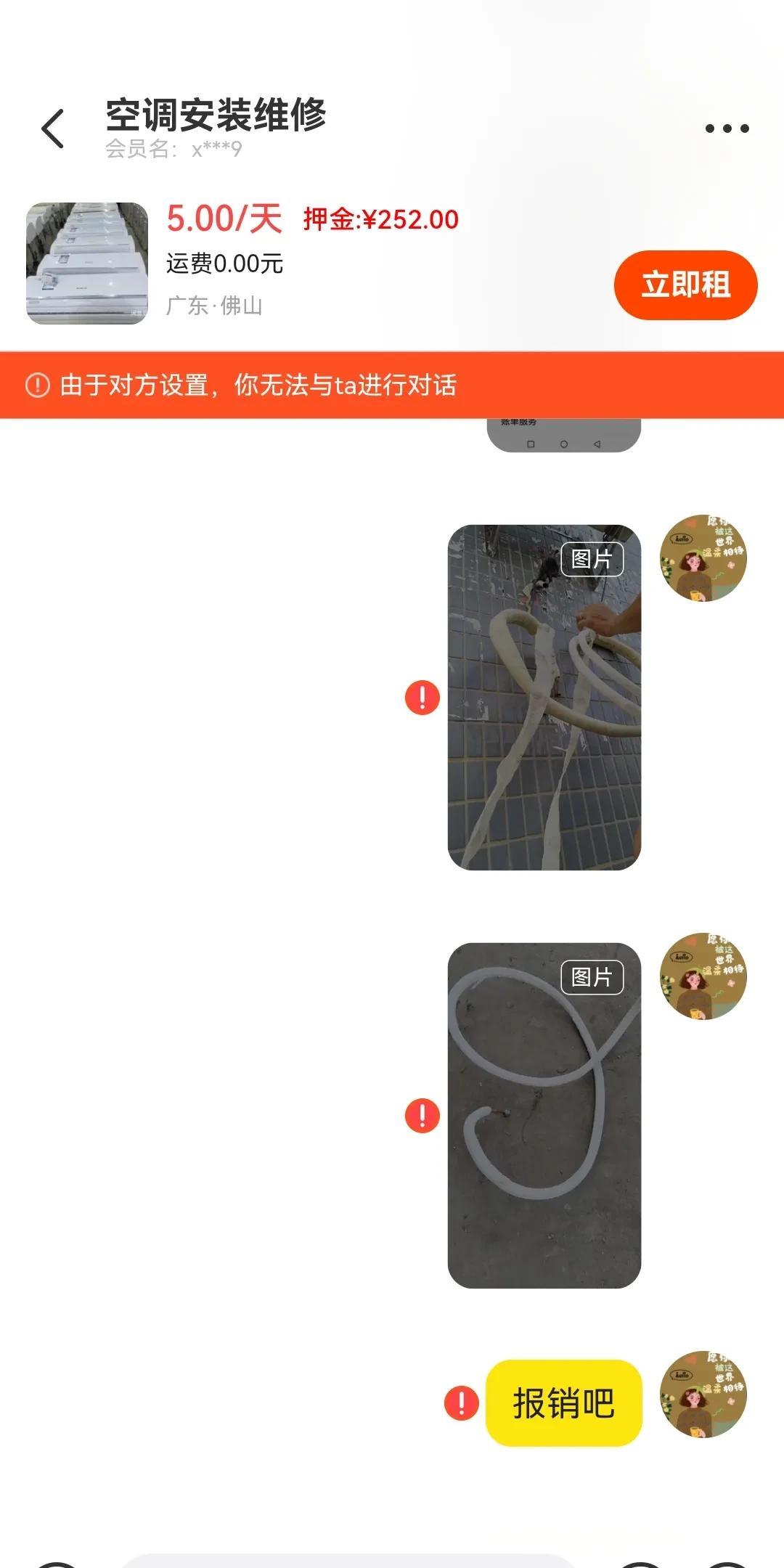 花了180元把空调修好了,把我气得够呛。 某鱼的商家说让我叫人修空调,修好后他报销。 我抱着怀疑的想法叫人修空调。 并不是他说的电容坏了,是管子不行,是铝管,铝管漏液,全部漏完了,因此不制冷。 很快换好了,这师傅是实体店的,态度也好,做事负责任。 他说他家的空调比我们这个还好,1000块可以了。 换好后我联系某鱼的商家,这时发现他拉黑我了,根本联系不了。 以后再也不在这平台买东西了,出现了问题一点也不负责任的。 也不是钱的问题,这售后服务态度,都别在某鱼买二手空调了,还是去实体店买的好。