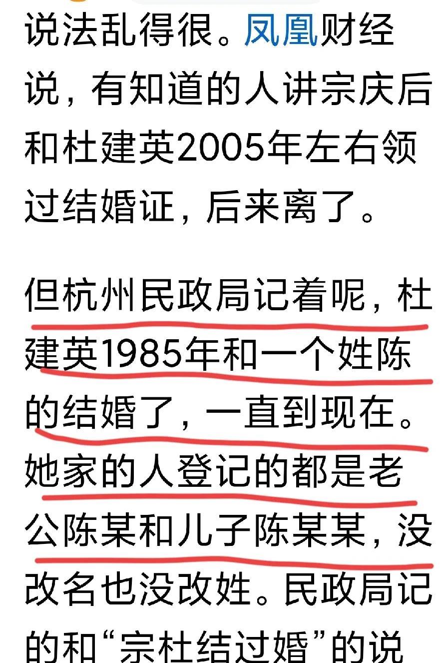 越扒事越多…… 刚看到一篇文章说杜建英早在1985年就已经与一陈姓男士登记结婚了,还有一男孩,目前她家的人登记的都是老公陈某和儿子陈某某? 版本太多,弄不准哪个版本是真是假了。 不过从全网的信息量来看,挺宗馥莉的绝对多,这也印证了这个社会的人绝大多数都喜欢遵守公共良俗,痛恨违背伦理道德之事。 有一点的是,宗家的哇哈哈集团承载的一份企业精神不可否定,单说24.6%的职工持股吧,就足以说明这个企业是值得信赖的,它带动的社会效益可能无法用数据计算了吧? 还有每年上交的国家税费。 成绩固然是值得点赞的,宗馥莉的能力也是不可小觑的,能让企业收入从500亿增长到700亿,这可不是每个人都能做到的,所以宗馥莉是很有能力的掌舵手。 至于她叔叔说她性格古怪,六亲不认等说辞,说白了无非是管理过于严格让一些浑水摸鱼的人忍受不了罢了。 这次杜建英以三个孩子的名义起诉宗馥莉,说是宗馥莉动用了香港信托资金110万元,但知情人透露宗庆后并未在香港设立网上所说的18亿信托资金,看来事件又一大反转。 如果宗庆后真没有为三个孩子设立信托,那杜建英开的此局的意义何在?难道就是为了家丑外扬吗? 她这一举动难道不会对孩子今后的学习工作等有影响吗? 不少人说杜建英是公司的元老有功,但那时候她也是拿工资的吧,只不过是为了挣工资完成自己的工作而已,不能因为完成工作而把公司运营到一定的高度而算作自己的功劳,再者即便是有功,当年公司难道不奖励她吗? 再有功也不能成为自己破坏别人婚姻家庭的第三者,仅仅凭这一点就会遭到世人唾弃。 从目前的信息来看,杜建英有可能到最 后会搬起石头砸自己的脚。 现在让人重点关注的是杭州国资委占46%股份,属于最大股东,娃哈哈集团每年按照46%的分红是不是都悉数到位进了国家账目?