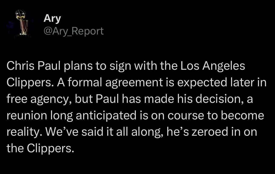 保罗即将加盟快船!!! 据NBA记者Ary爆料:克里斯保罗计划与洛杉矶快船队签约