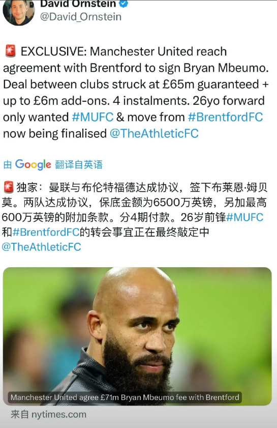 DO: 曼联6500万镑固定加600万镑浮动签下姆贝乌莫,由于分4期支付,总费用增加了100万镑!浮动部分包含获得欧冠资格等不太容易的条款!