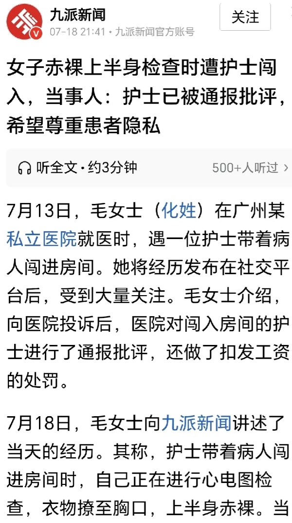 7月18日,九派新闻报道,一女子赤裸上半身检查时遭护士闯入。