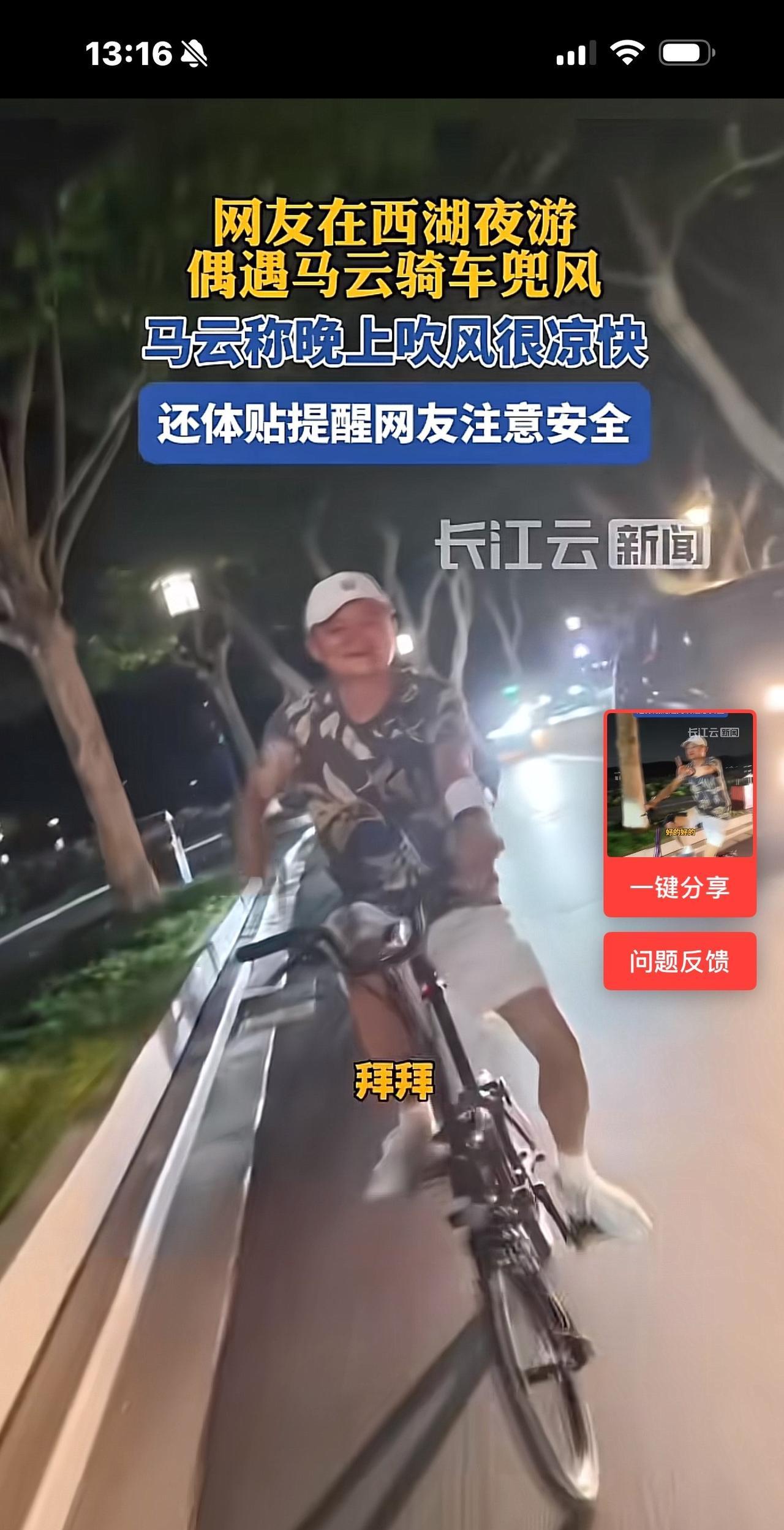 马云在西湖骑行兜风,春风满面,60多岁了,回眸一笑,好年轻啊! 前晚,有一位女网