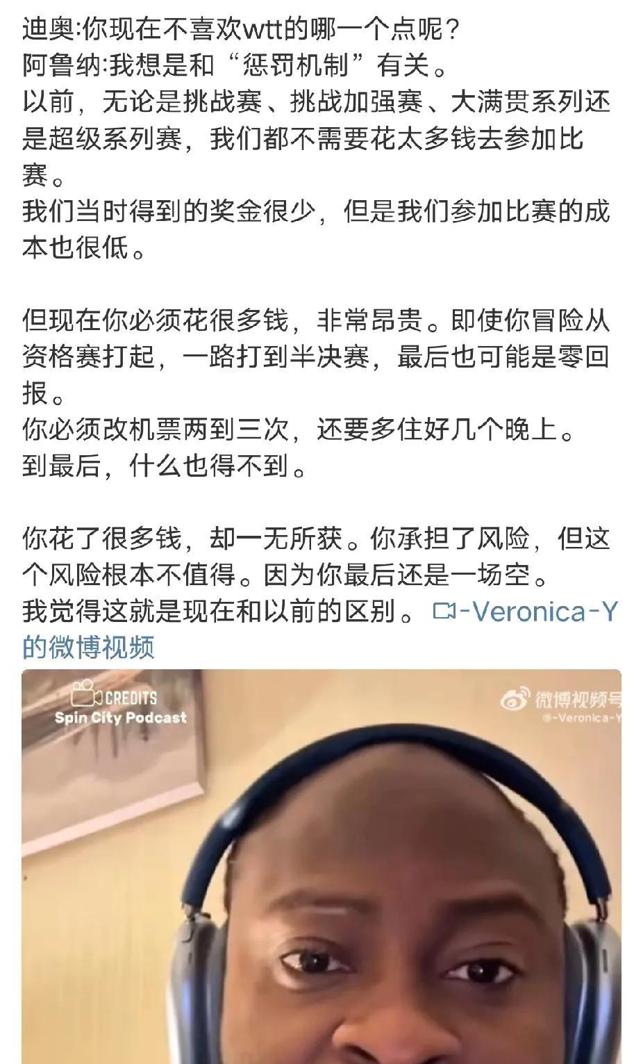 爱和尊重,不仅仅是靠自己的本事一拍一拍打下来的,也是运动员的人品、球品、人格魅力挣来的。 无论是对运动员个人、还是对于一个俱乐部、一个赛事方来说! 而达不溜梯梯,它永远无法拥有这些爱和尊重。 情感关系中我们会说,所有那些需要你单方面委屈自己去忍受、去维系,而另一方永远在索取的关系,它从一开始就是错的! 这个道理,同样也适用于职场。 写这个感受是因为,我刚刚看到了阿鲁纳的一个采访。 主持人问他: 阿鲁纳说: “以前,无论是挑战赛、加强赛、大满贯赛还是超级系列赛,我们都不需要花太多钱去参赛。 虽然,我们当时得到的奖金也很少,但是,我们参加比赛的成本也很低。 但现在,你必须要花很多的钱,非常昂贵!即使你冒险从资格赛打起,一路打到半决赛,最后也可能是零回报。 你必须改机票两到三次,还要多住好几个晚上。 到最后,你什么也得不到。 你花了很多钱,却一无所获! 你承担了风险,但这个风险根本不值得。 因为你最后还是一场空!” 这段话字字泣 血,一个人对一个组织不满,可能是这一个人的问题,但当所有人都不满,这就是民 怨。 球员要配合花一万的粉丝拍照、签名,球员要出席签售会,要不同程度地取悦粉丝,转让自己的肖像权,无条地配合达不溜踢踢的一系列商业运作,以此吸引更多地粉丝,增强自己的商业价值,也去反哺达不溜踢踢。 可是站在运动员的角度呢? 我相信如果可以选择,很多人只想好好打球!只是,他们没有足够的能力和影响力去说“不”。 也庆幸,后来有一个最勇敢、脊梁最硬的人首先站了起来,让所有人的处境被看见。 这条由前任定向、并大力支持的商业化之路,如果连运动员的基本保障都没有,如果极尽压榨,把所有的利益都流向不可说、不能说的地方,这样一个组织,如果它 不完蛋 ,天理何在。 也愿我们丰盛而强大,无惧任何一段不好的关系破碎,无论哪个领域。