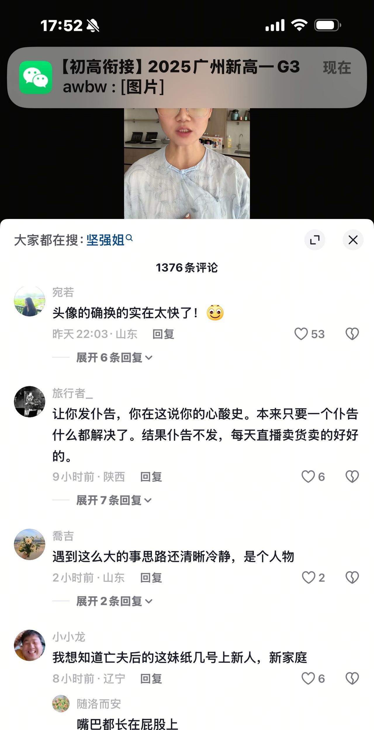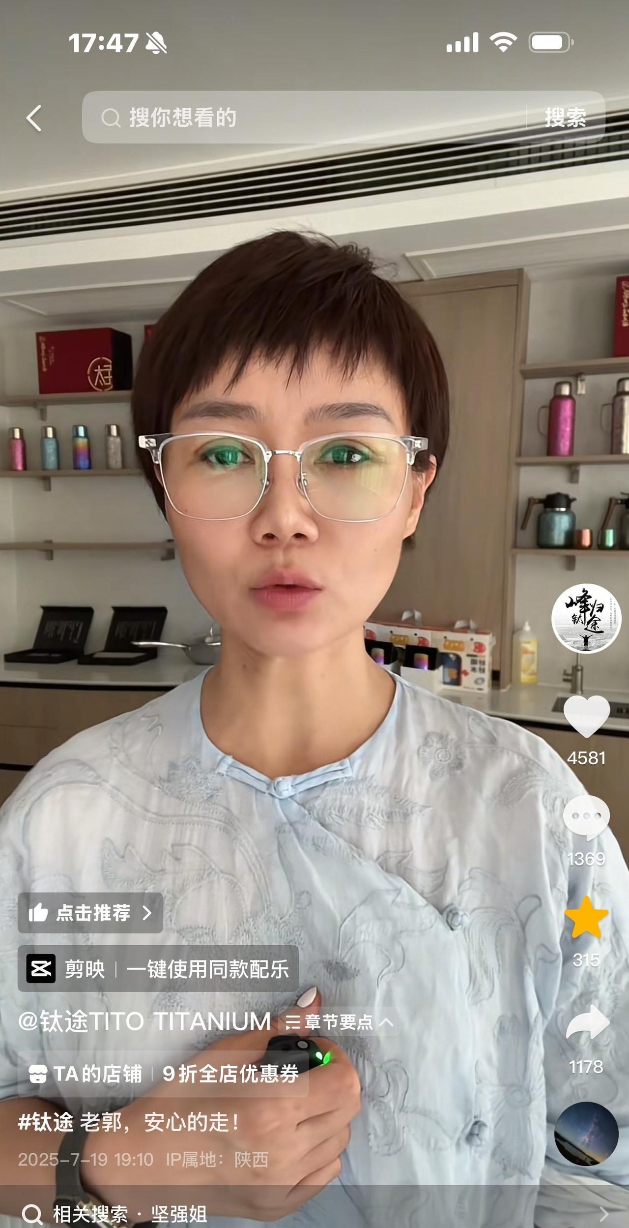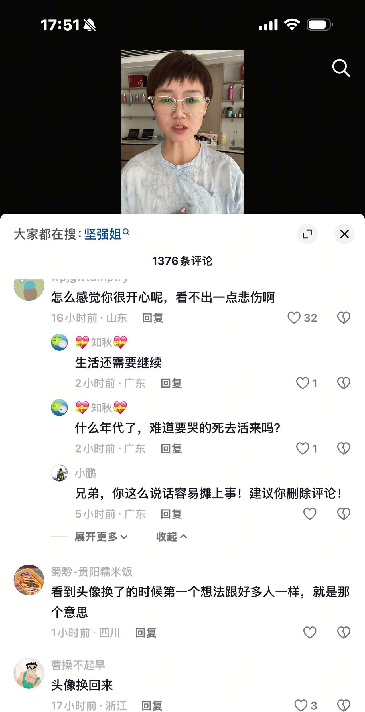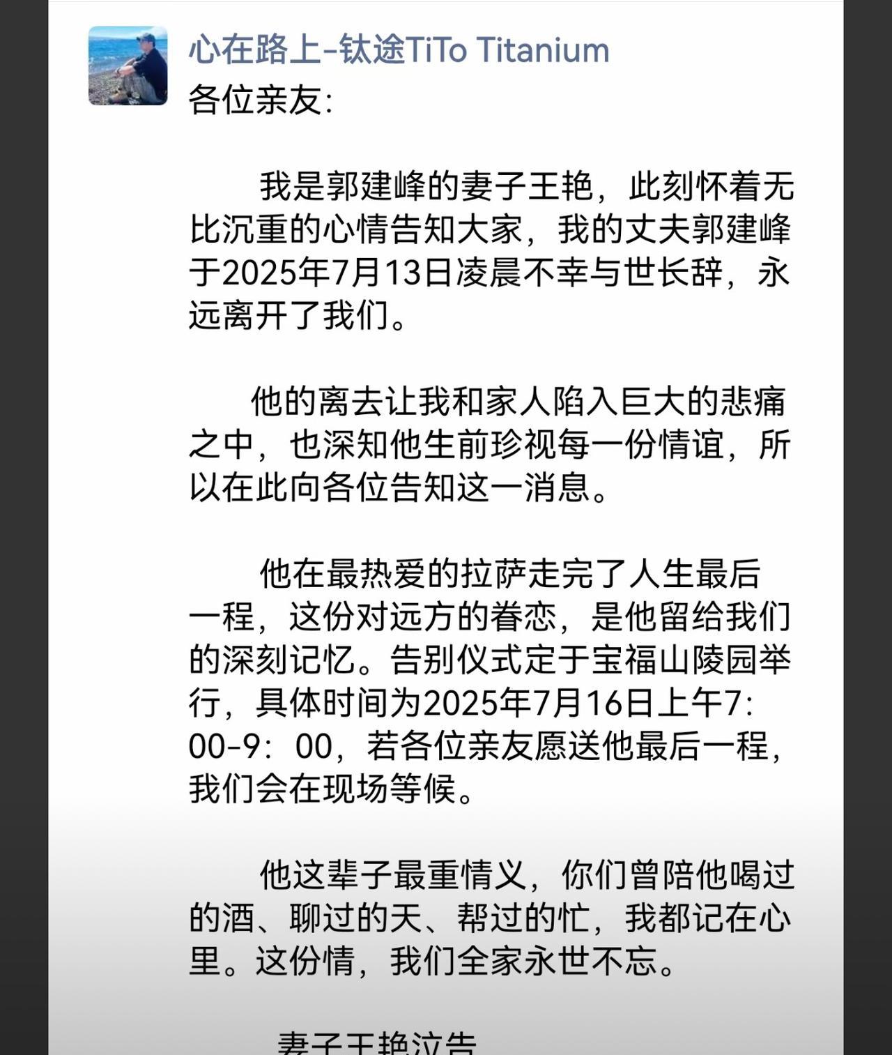 41岁的钛途老板郭建峰刚去世,妻子就把他的账号更换成自己笑眯眯的头像,网友说她太急了,看不出一点悲伤。 7月13日,陕西老板郭建峰自驾车,从陕西宝鸡出发,驰骋3千多公里,去西藏冈仁波齐朝圣,夙愿未了,不幸中途倒在音乐酒巴“拉萨之歌”门口,疑劳累喝酒突发心梗去世。 妻子王艳15日发了一份诰告,内容言简意赅,又十分动人 说: “他在最热爱的拉萨走完了人生最后一程,这份对远方的眷恋,是他留给我们的深刻记忆。” “他这辈子最重情义,你们曾陪他喝过的酒、聊过的天、帮过的忙,我都记在心里。这份情,我们全家永世不忘。” 这份得体的讣告获得了大家的称赞,说明王燕对丈夫喜欢自驾旅行有深深的理解,并支持他,还点名了丈夫的优点,重情义,朋友也多。据说来参加丈夫追悼会的人都有好几百,可见郭建锋在钛行业有些名气,也有一定影响力。 7月19日,妻子王艳突然更换了丈夫抖音的头像,换成了自己的个人照片,照片中,她笑容灿烂,神采奕奕,俏丽迷人。王艳说,这是丈夫前不久帮她拍的。 王艳短发利落,戴着眼镜,看起来大概40岁左右,她穿着一件浅蓝色的改良旗袍装,出镜第一句话就是“请教我坚强姐”,表明要接管丈夫的生意,他没尽完的责任自己来扛,没完成的梦想她帮他去完成。 王艳坦白说,照顾家里她还有底气,但是面对丈夫的事业而有信心,时而很迷茫,以前有丈夫在她可以做甩手掌柜,日子过得随性安稳,丈夫猝然去世,现在,生产线上的工艺参数她要去吃透,业务上的弯弯绕绕也要去摸索,闲言碎语她更要去扛。虽然她不及丈夫熟悉这个行业,但为了两个女儿,还是战战兢兢,鼓起勇气,准备迎难而上。 王艳的发言十分动人,看起来也像是一个有知识有文化的贤妻。 但有网友对她如此快速更换丈夫的头像不满了,说她还画着那么漂亮的妆,眼睛都没有哭肿,不见一点悲伤的样子。 “果然是坚强姐,要是我,估计一年半载都在哭” “人家真坚强,我老公去世,我哭了好几年,五六年才走出来” “真爱正常的,可是有些不是” “这个头像不该换呀!还是太年轻了与丈夫百天都没过,这个号也是丈夫做起来的,大家买产品也是冲着钛途来的,头像一换这个号就….” 巴拉巴拉………闲言碎语不少。 但也有人认为,王艳现在换头像、发这个视频是为了给自己加把劲,做了很大很大的决心要带领钛途走下去,鼓励王艳不用理会流言蜚语,坚持做自己! 迫于外界的压力,今天,王艳又把丈夫的头像换回来了。 这让我们思考,如果一个做企业的丈夫突然离世,妻子真的要在公众面前表现出伤心欲绝吗?你认为王艳快速更换丈夫的头像到底合不合适呢? [微风][微风]