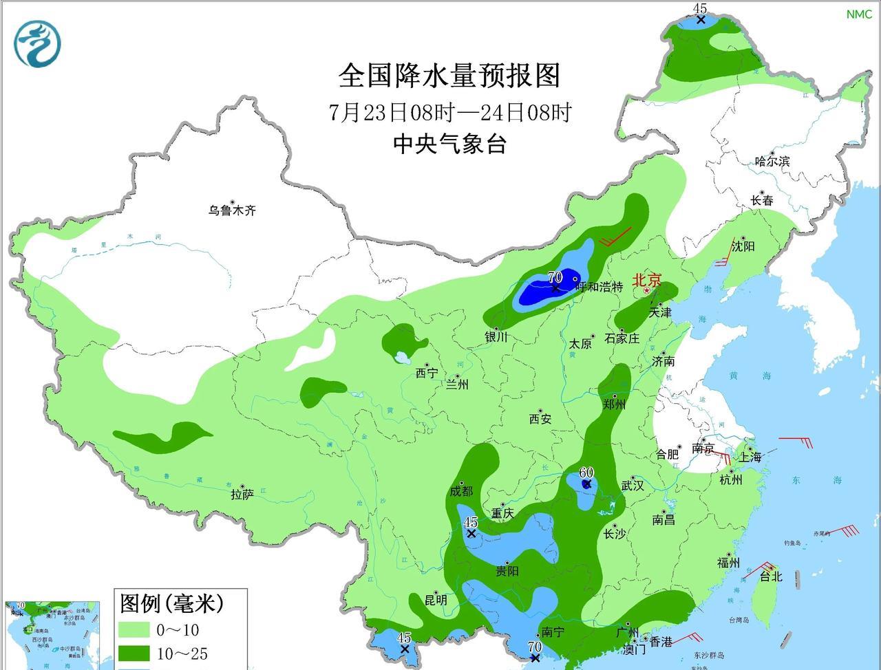 昨日今晨,在台风韦帕北方槽前切变主导的雨带下,有超过20个国家站点达到大暴雨量级