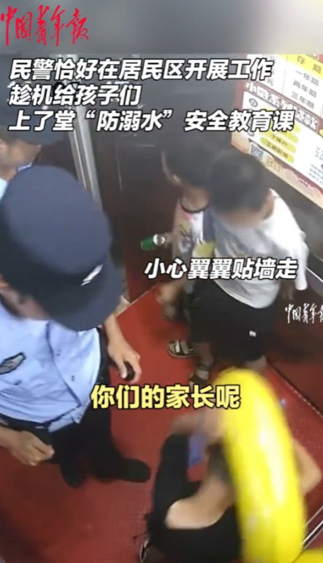 孩子们一听,这和自己不全都对上了,这时,电梯门开了,民警去楼上走访,而一男孩边走边保证:“警察叔叔,我们不去游泳了!“