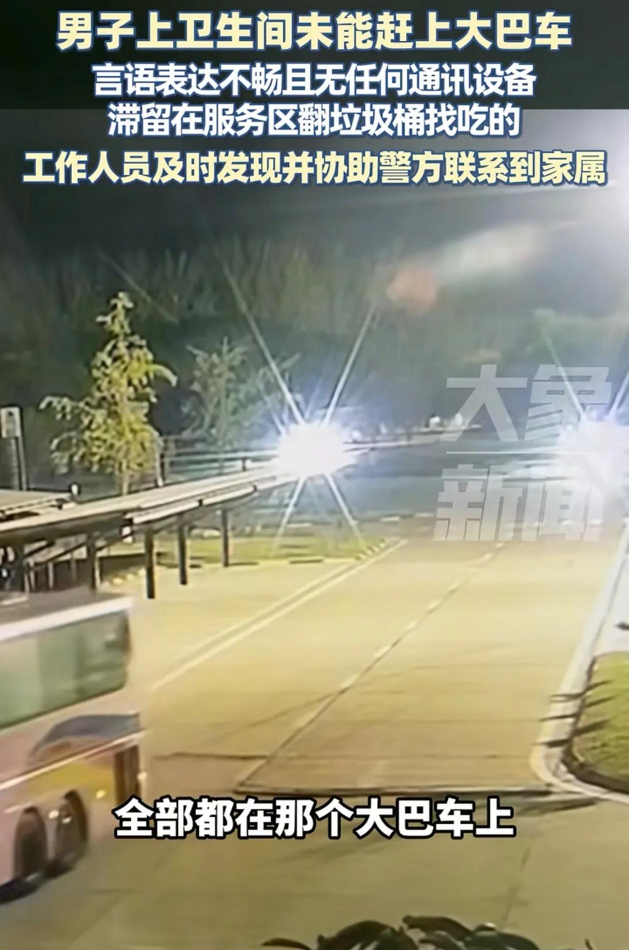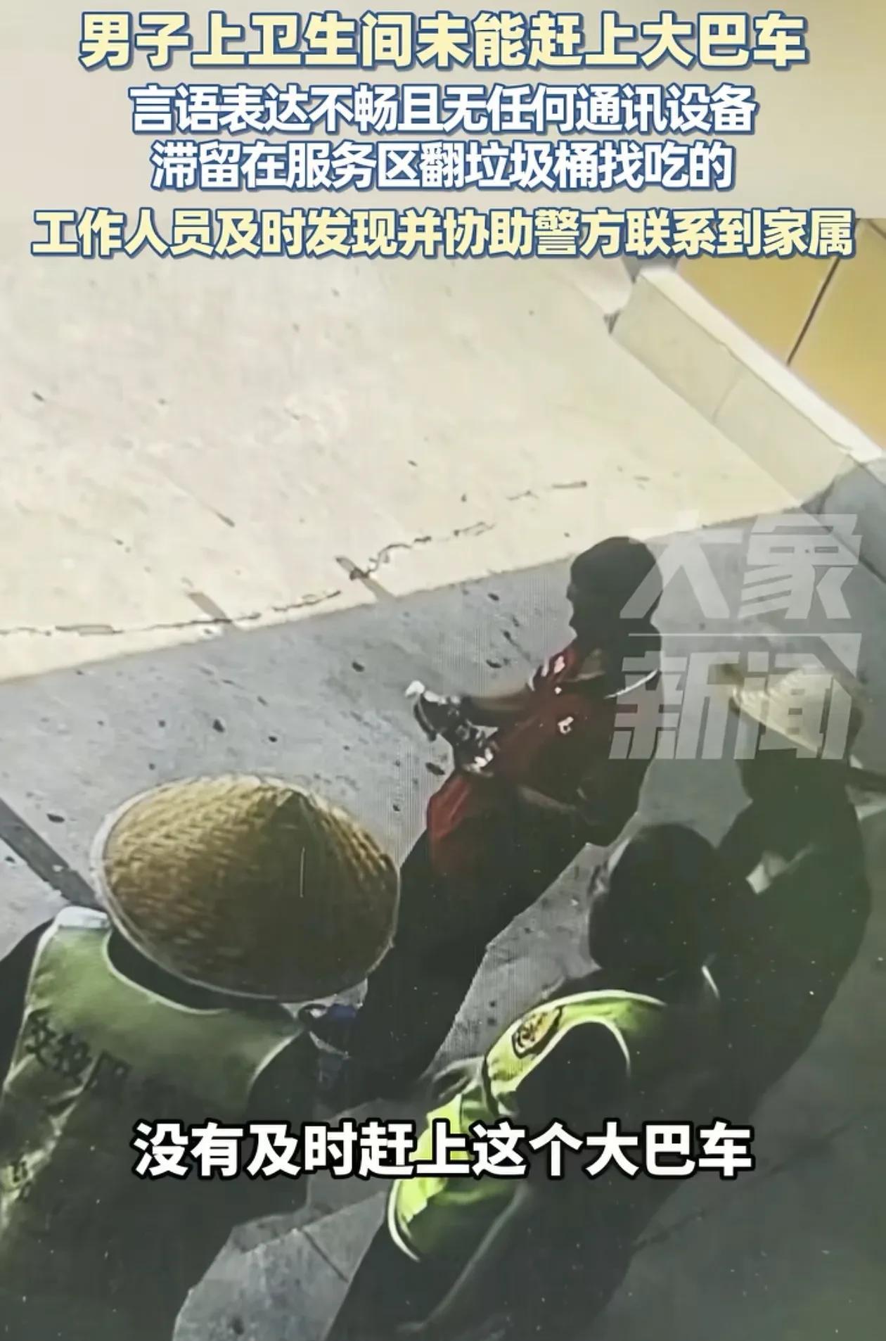河南周口,2025年7月,男子跟着打工队伍坐大巴去苏州,中途停车时他赶紧跑去厕所,结果出来时大巴车早没影了,更让人糟心的是他身上只有一张身份证和车票。 男子本想找人帮忙,可奈何可他语言表达起来不太顺畅,说话含糊,比划半天路人也没听懂。 兜里又一分钱没有,一天下来人饿得心发慌,他只能蹲在垃圾桶边翻找。先是扒拉出半袋发硬的馒头,又捡到半瓶矿泉水,混着灰尘就往嘴里塞。 服务区工作人员看到了觉得不对劲,这汉子衣裳沾满油灰,手指头抖得握不住馒头,眼神直发木。便一把拉住他:“大兄弟,遇啥难处了?”最后经过一番沟通,工作人员才了解了来龙去脉。 眼看人还饿着呢,工作人员一边带他去餐厅先吃了点东西,另一边又联系到了他的家人。很快,男子家人就来到了服务区,把他给接走了。 这男子还算运气好,碰上细心的工作人员。像去年冬天有民工被落服务区,硬是走两天冻昏在山林。 客运司机发车前本该数人头,可这车开出去半天都没发觉少人。《道路旅客运输规范》白纸黑字要求“到点清人”,可总有人图省事。要是踏踏实实把工作做到位,哪会闹这出呢? 大家觉得司机是不是有点太草率了呢?